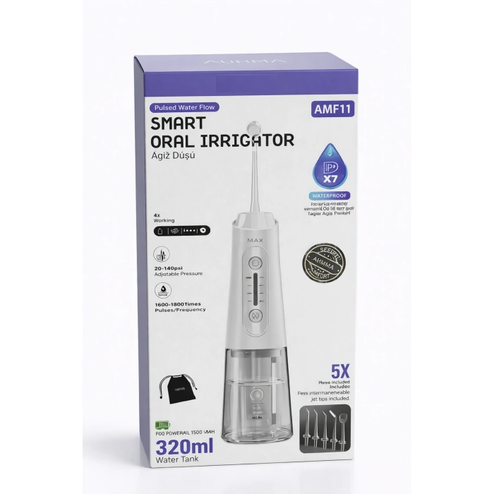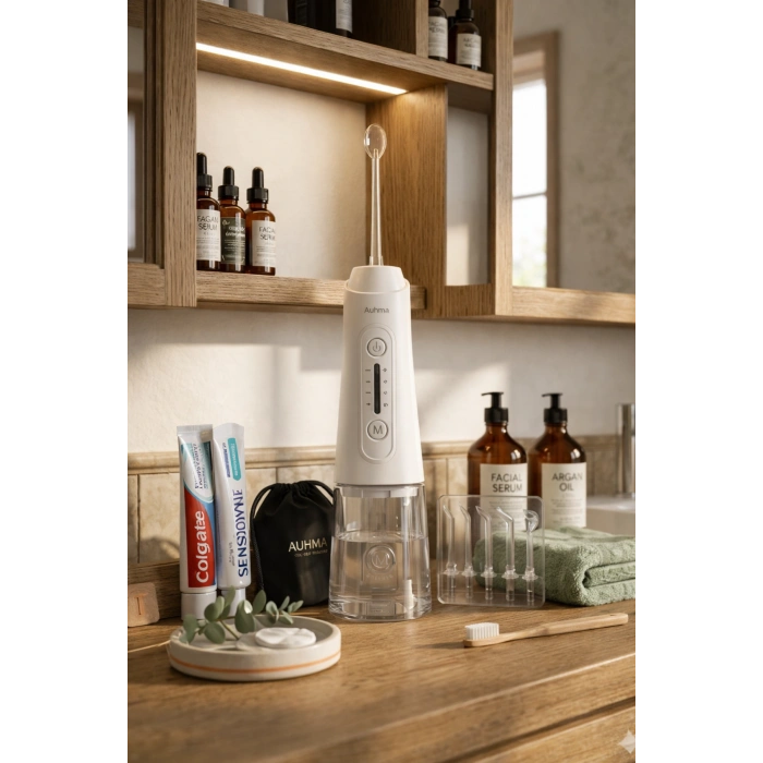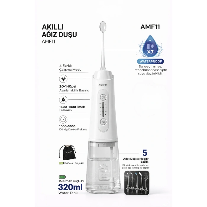 Auhma AMF11 ağız duşu, diş fırçasının ulaşamadığı bölgeleri temizlemek için tasarlanmış pratik bir ağız bakım cihazıdır. Su püskürtme sistemi sayesinde diş aralarında kalan yemek artıklarının temizlenmesine yardımcı olur.