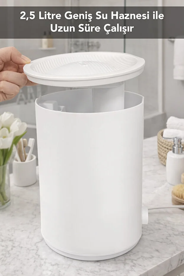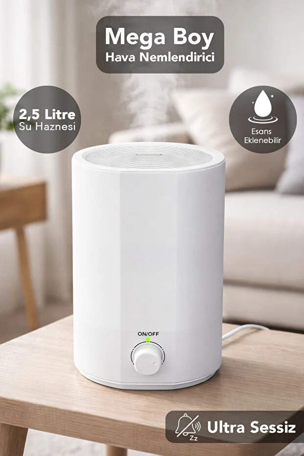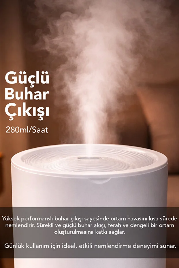 Ultrasonik buhar teknolojisi ile suyu ince partiküller halinde ortama yayarak havayı nemlendirir. Esansiyel yağ ekleyerek aromaterapi özelliğinden faydalanabilir, daha huzurlu ve rahatlatıcı bir ortam oluşturabilirsiniz.