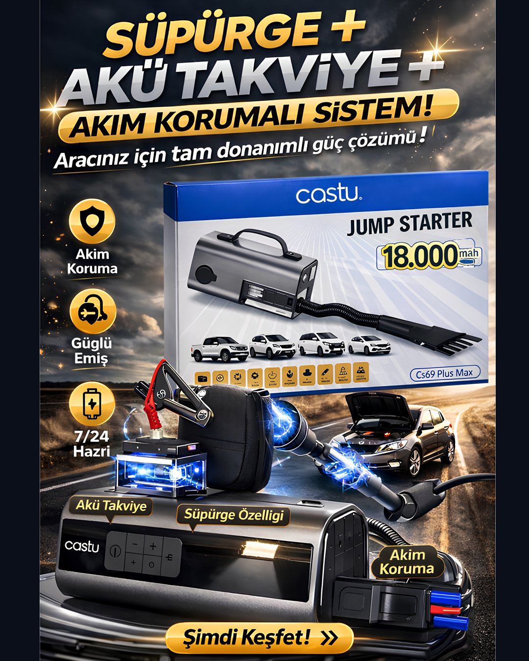Castu 10in1 Jump Starter akü takviye cihazı, araç kullanıcılarının ihtiyaç duyabileceği tüm fonksiyonları tek bir kompakt cihazda bir araya getirir. Akü takviyesi, hava kompresörü, süpürge, powerbank ve LED fener özellikleri sayesinde hem günlük kullanımda hem de acil durumlarda vazgeçilmez bir yardımcıdır.