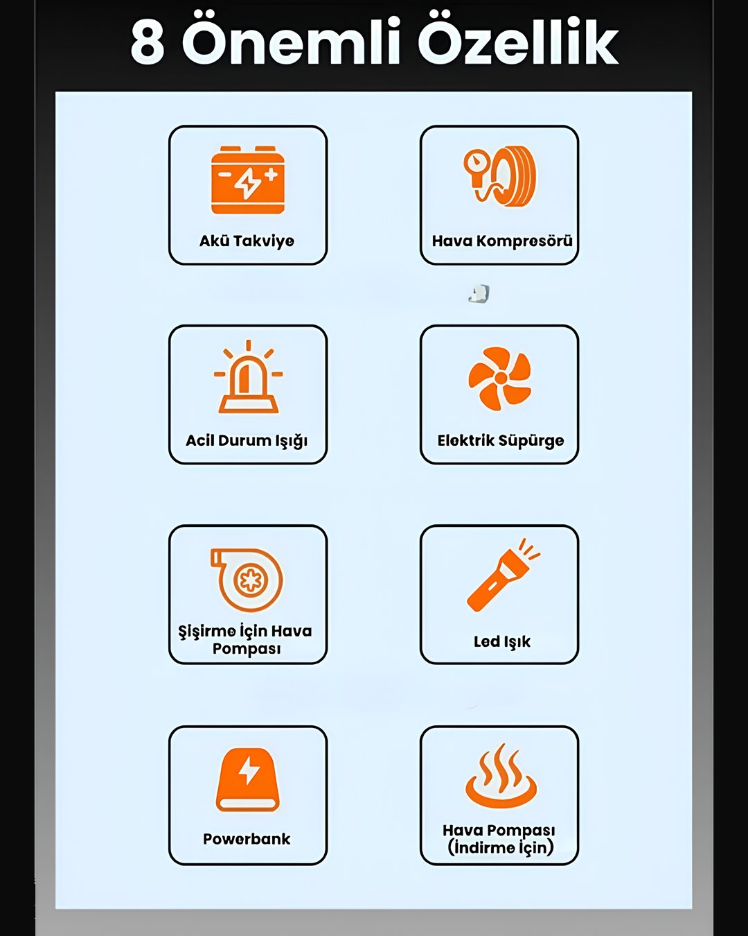 - Fonksiyonlar: Jump Starter + Kompresör + Süpürge + Powerbank + LED Fener