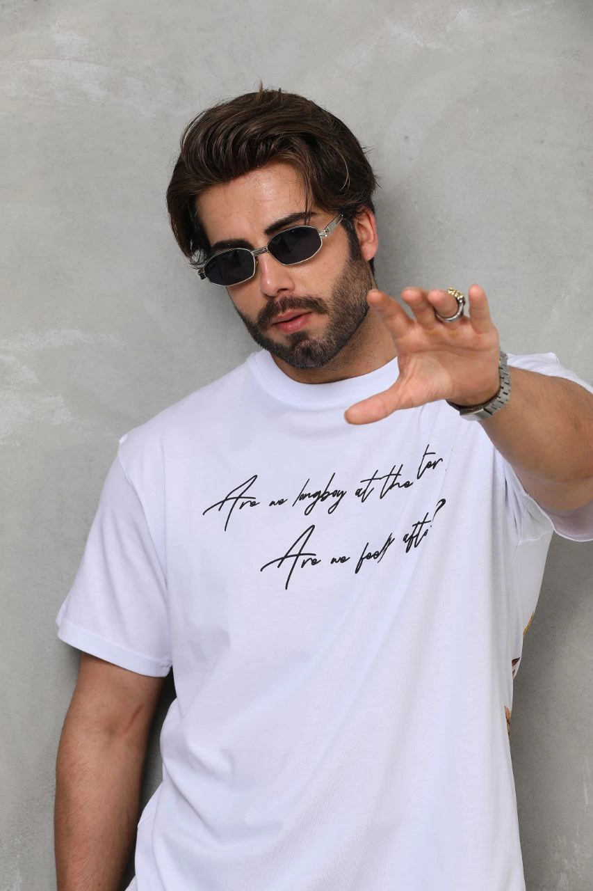 Erkek Bisiklet Yaka Baskılı Oversize T-Shirt – Beyaz