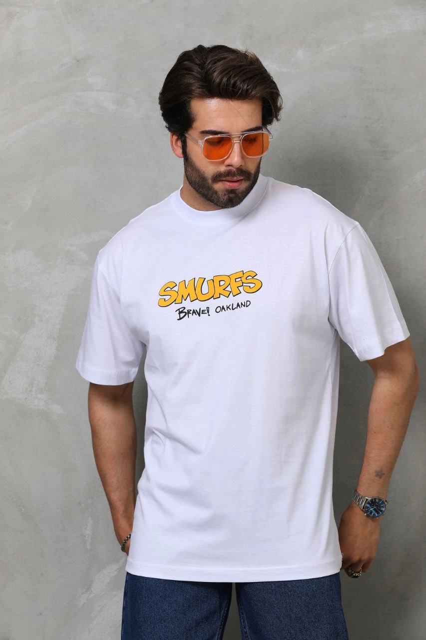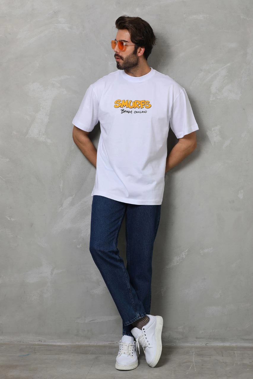 Erkek Bisiklet Yaka Baskılı Oversize T-Shirt – Beyaz