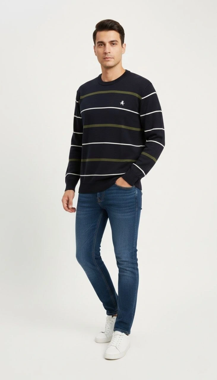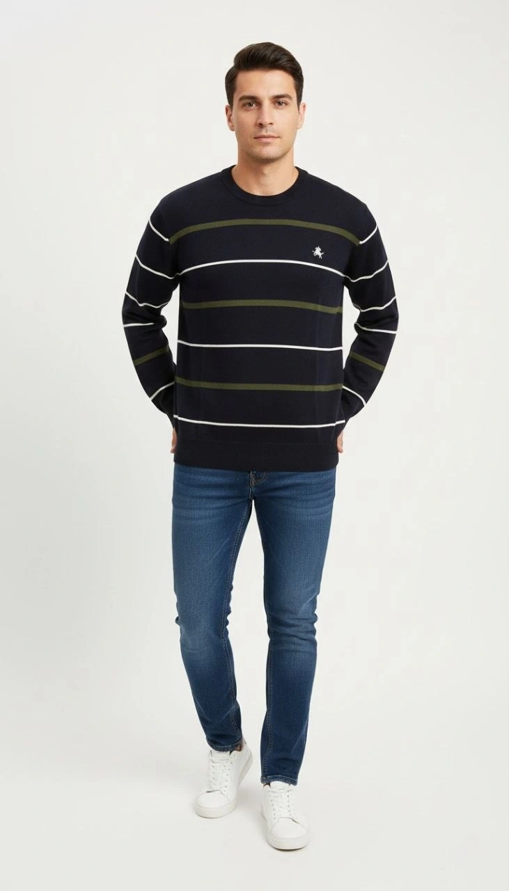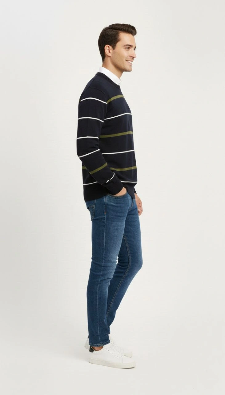 Erkek Bisiklet Yaka Cizgili Triko Kazak yumuşak dokulu Pamuklu ince Dokuma uzun – Lacivert