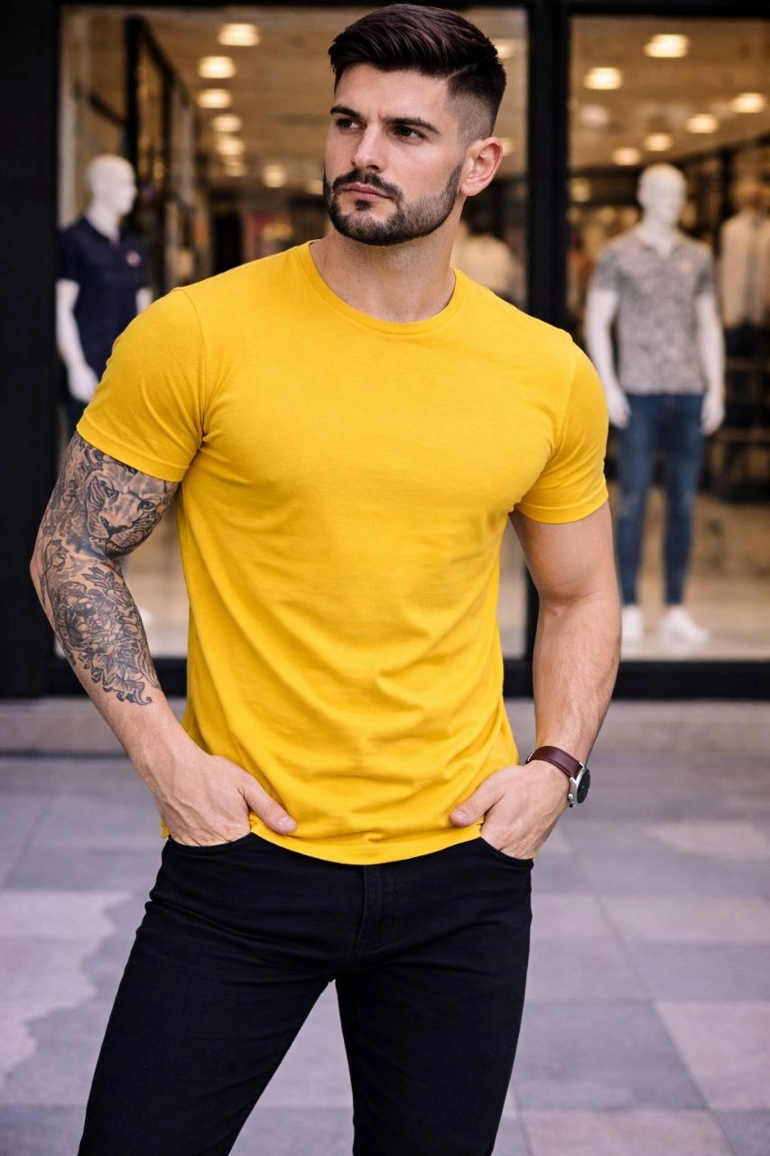 Be the first to review “Erkek Bisiklet Yaka Slim Fit dar kesim Likralı Tişört – Sarı”
