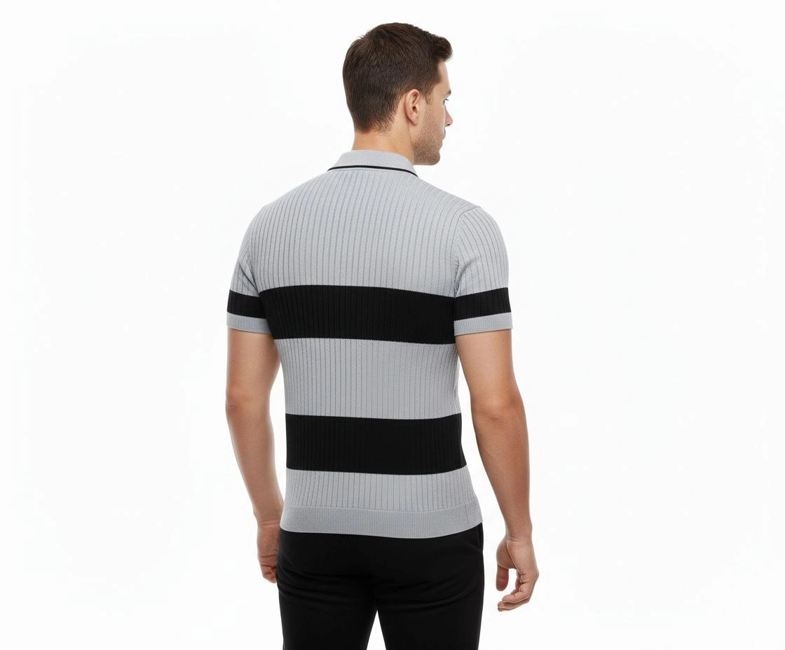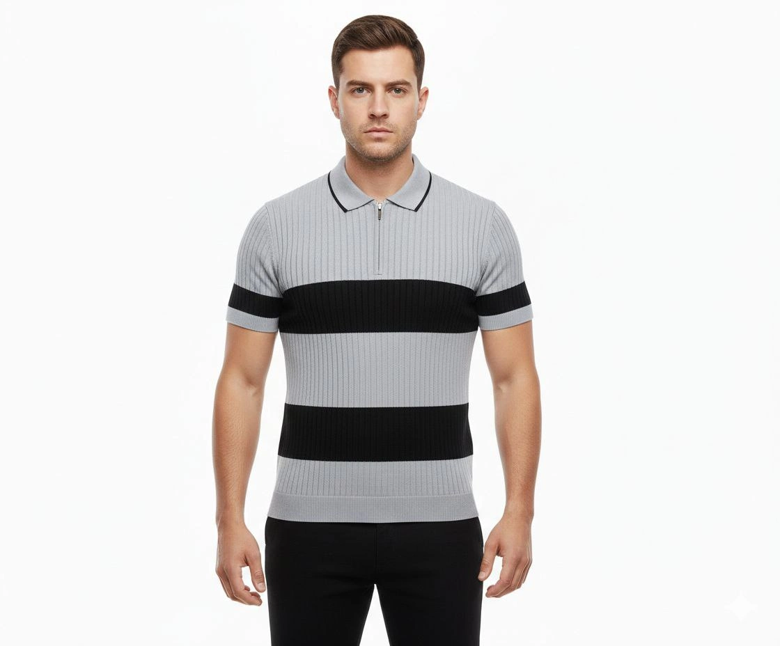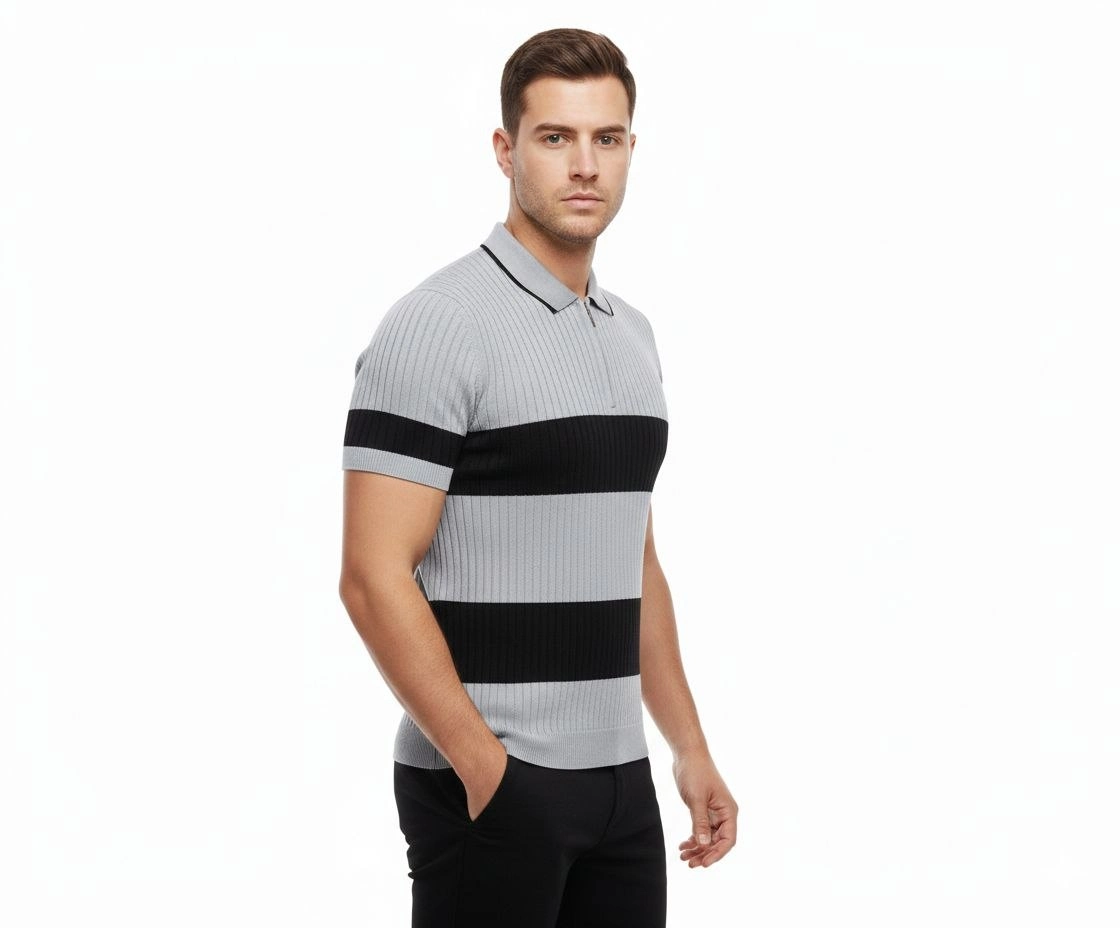 Erkek Çizgili Triko Dokuma Polo Yaka Yarım Fermuarlı Regular Kalıp Tişört – Gri