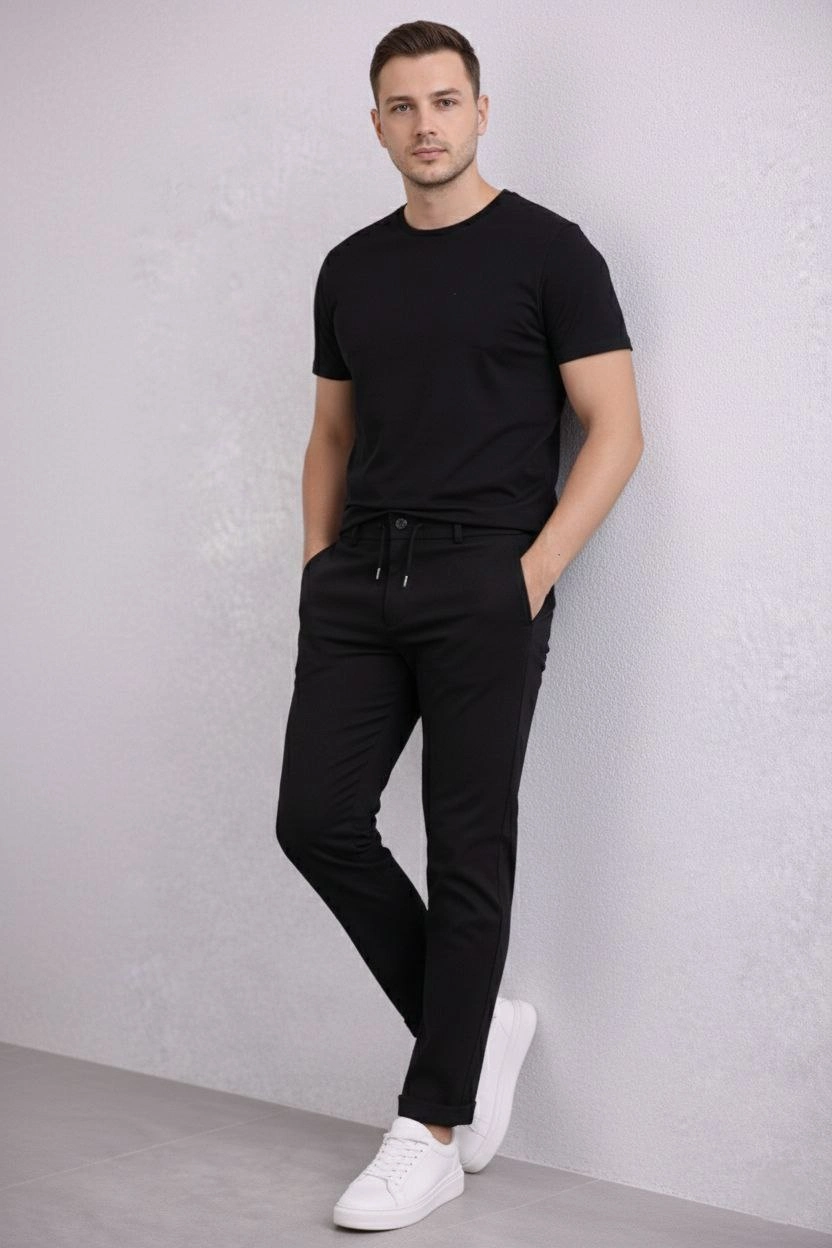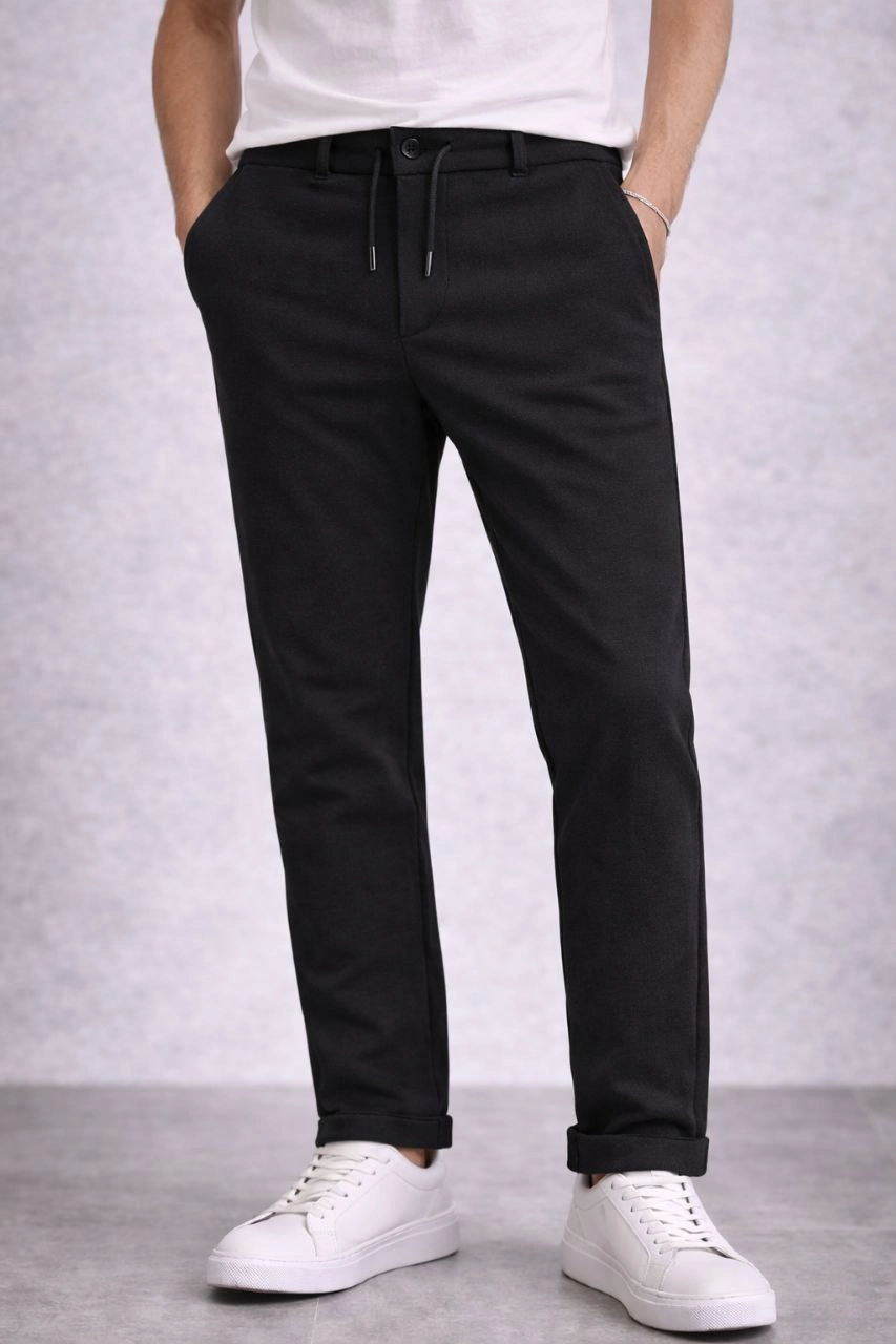 Erkek Diagonel Mikro dokulu Duble Paça Cepli Pantolon Bağcıklı Bel, Modern Kesim – Siyah
