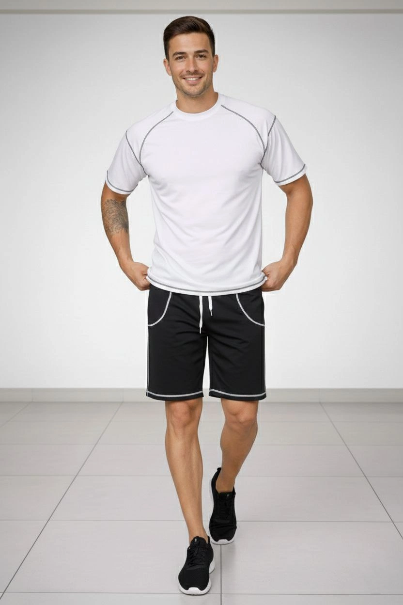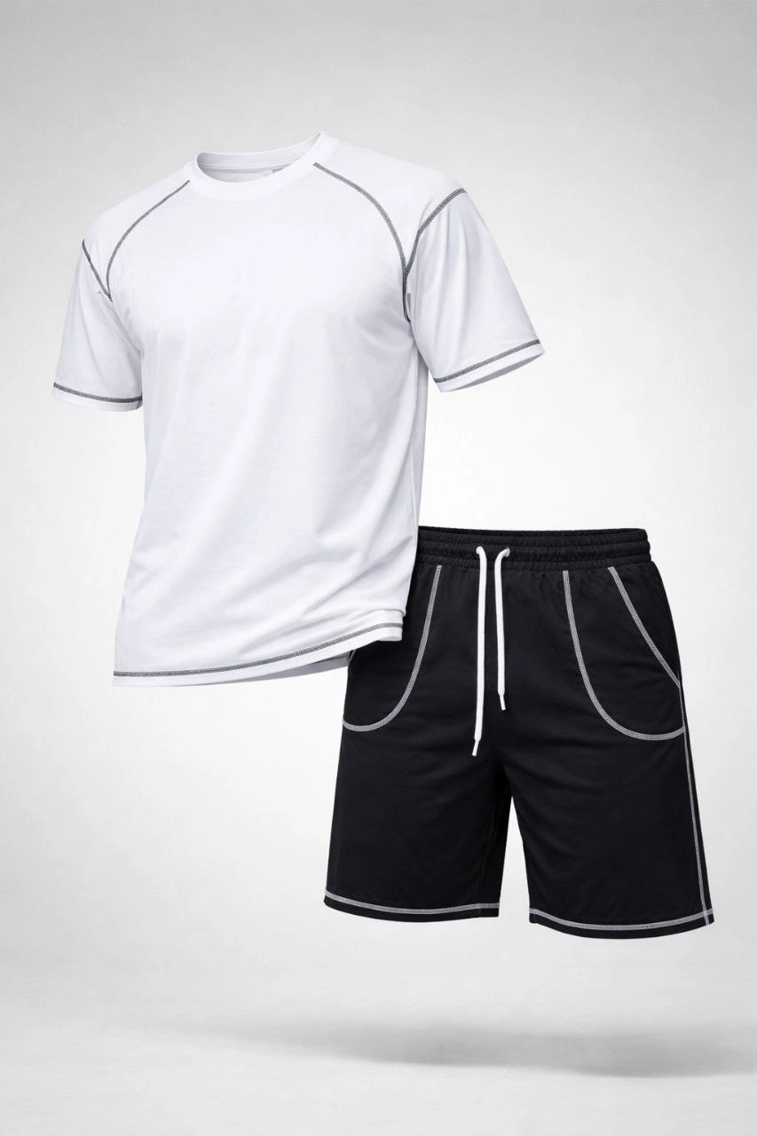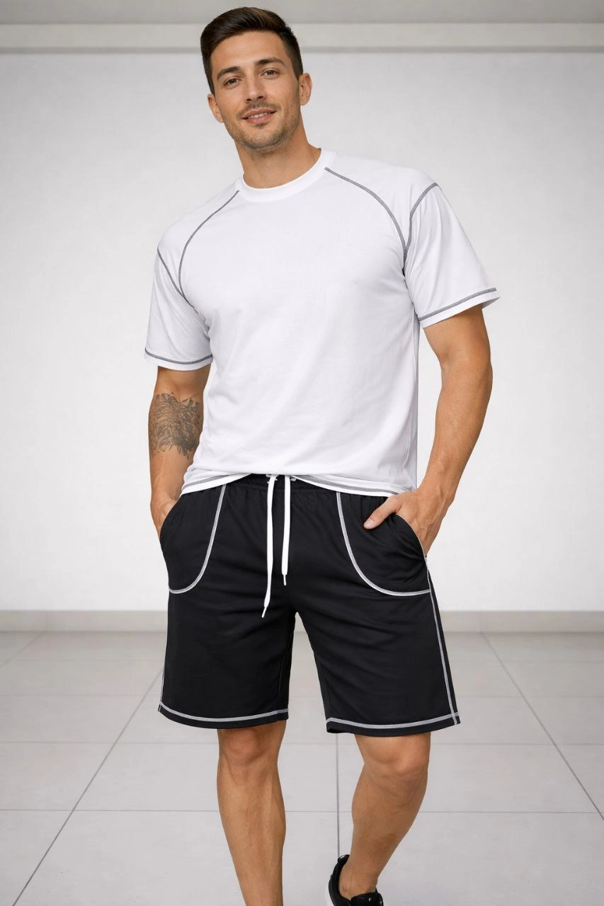 Erkek Spor Tişört Şort Takım Kontrast Dikiş Detaylı Ovarsize rahat kalıp – Beyaz