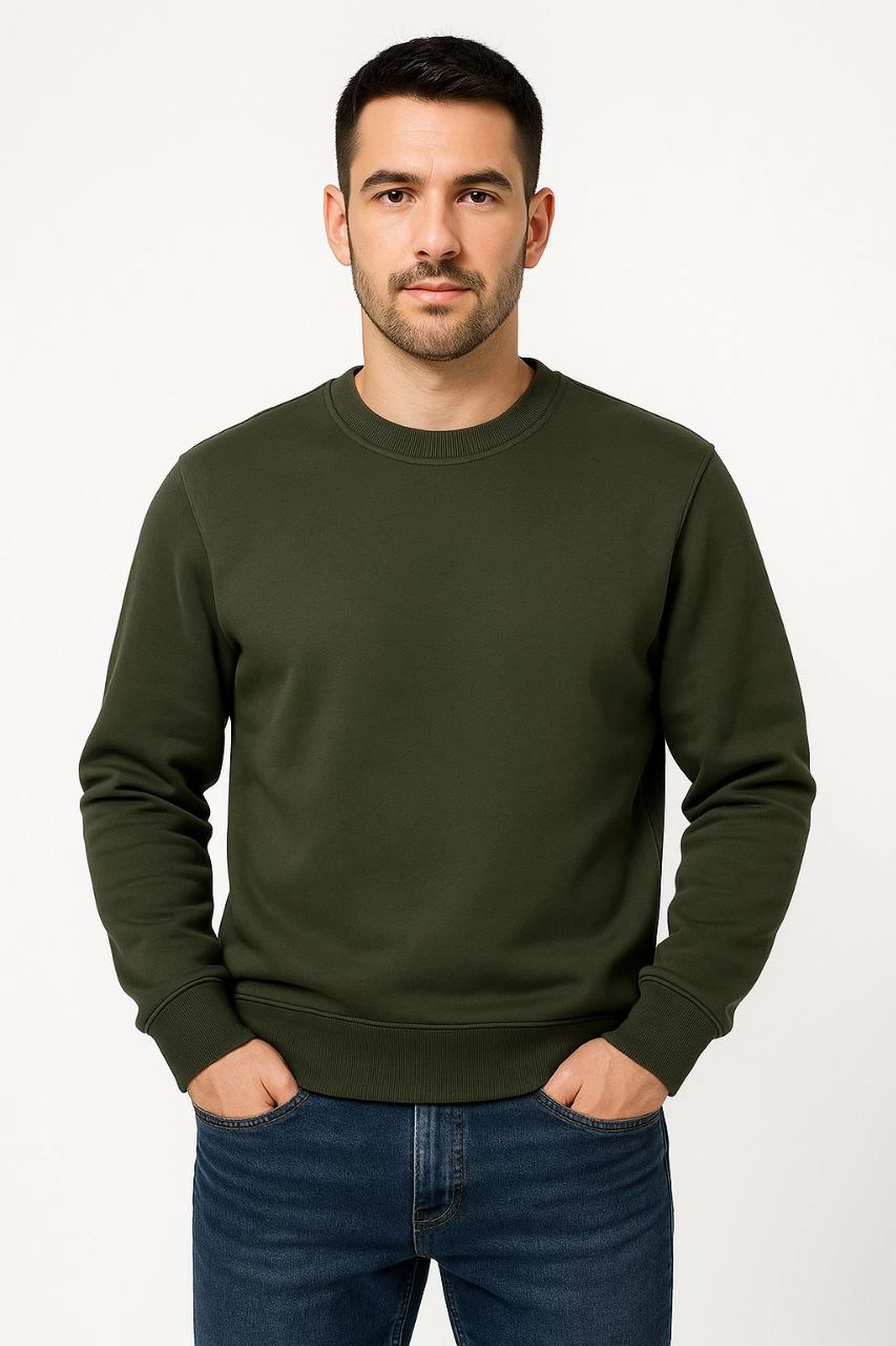 Erkek Üç İplik Düz Bisiklet Yaka SweatShirt – Haki