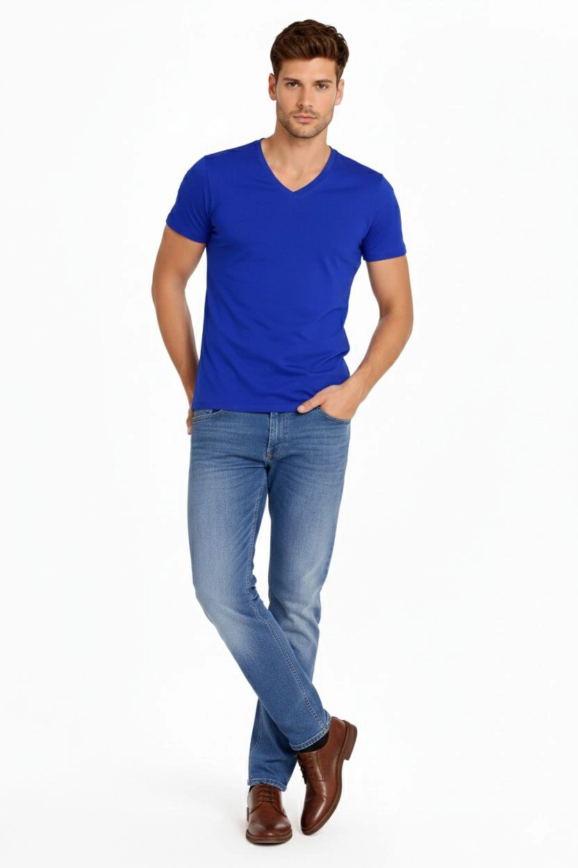 Erkek V Yaka Slim Fit dar kesim Likralı Tişört – Saks Mavisi