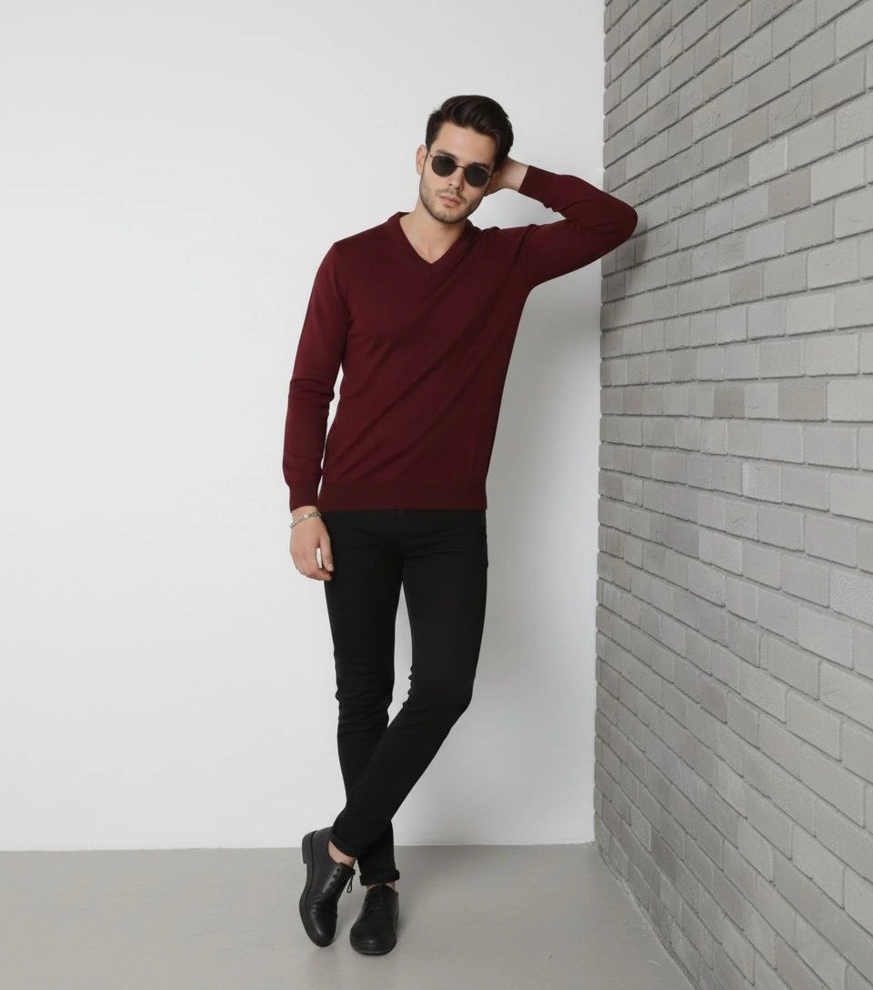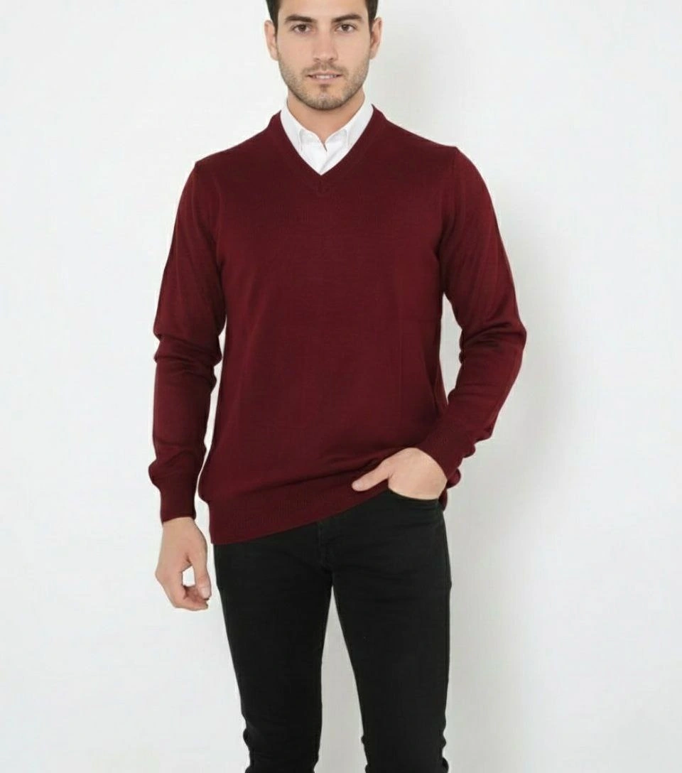 Erkek V Yaka Triko Kazak yumuşak dokulu Pamuklu ince Dokuma uzun kollu Regular – Bordo