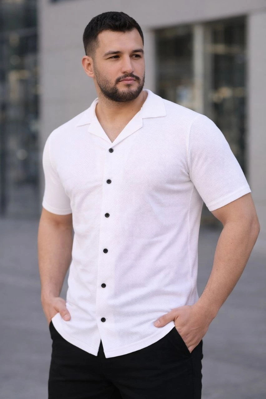 Erkek Waffle Kumaş Kısa Kollu Düğmeli Açık Yaka Regular Fit Gömlek – Beyaz