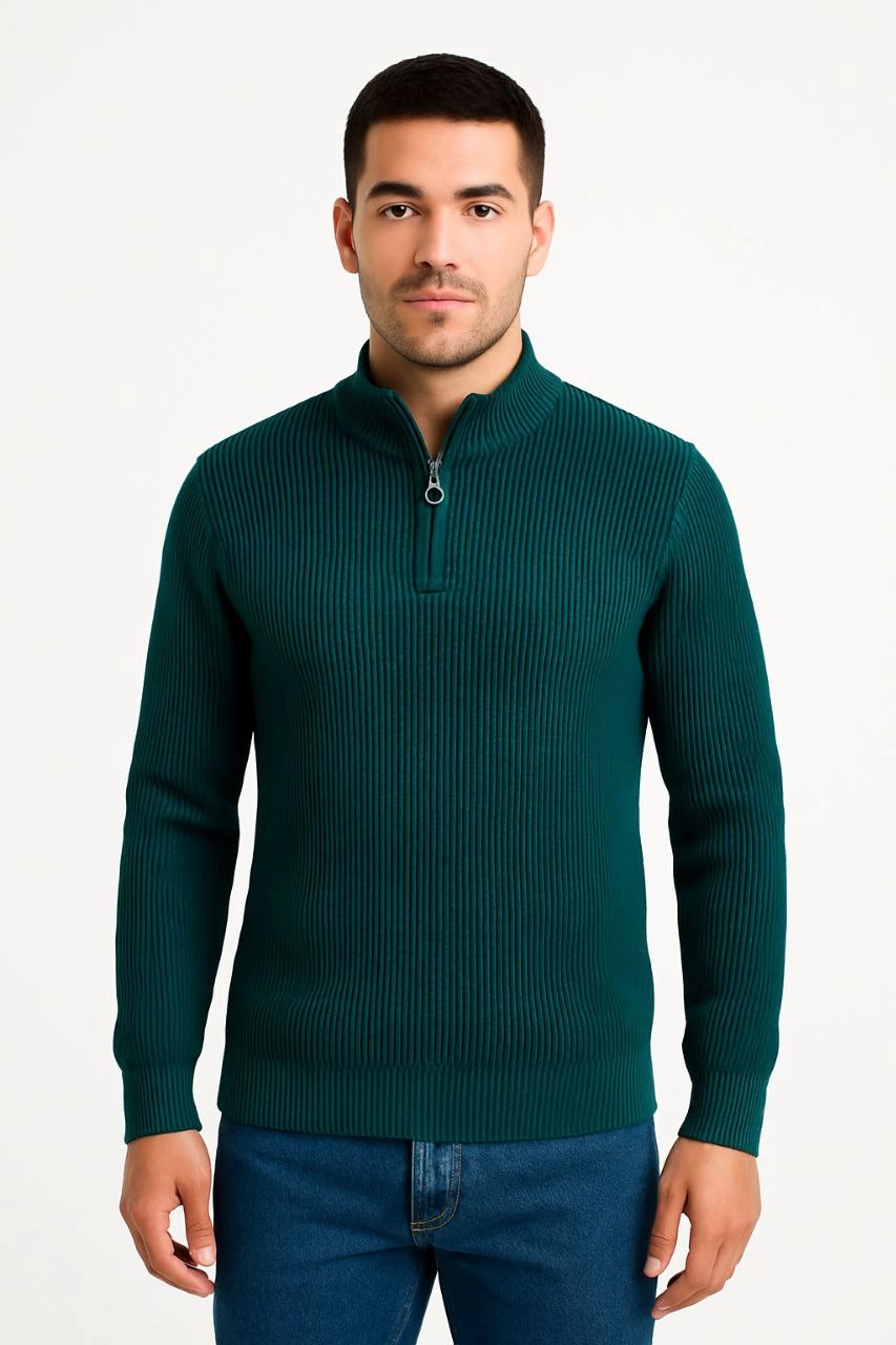 Erkek Yarım Fermuarlı Triko Kazak Selanik Örgü Dik Yaka Pamuklu Dokuma Regular Fit – Haki