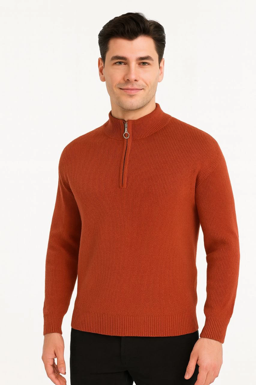 Erkek Yarım Fermuarlı Triko Kazak Selanik Örgü Dik Yaka Pamuklu Dokuma Regular – Kiremit