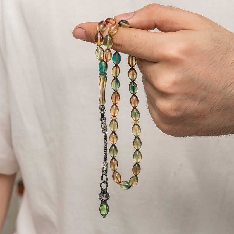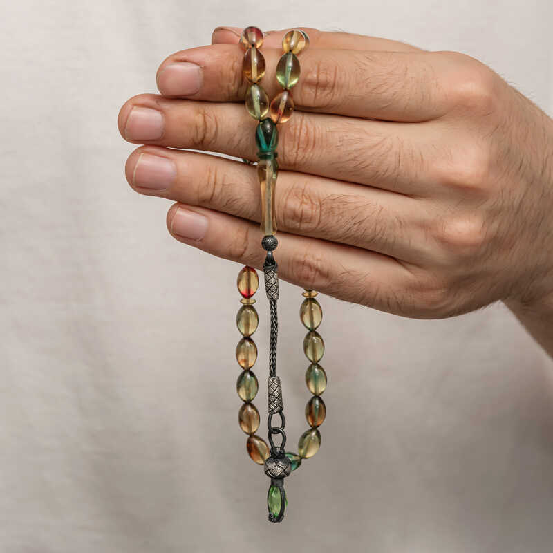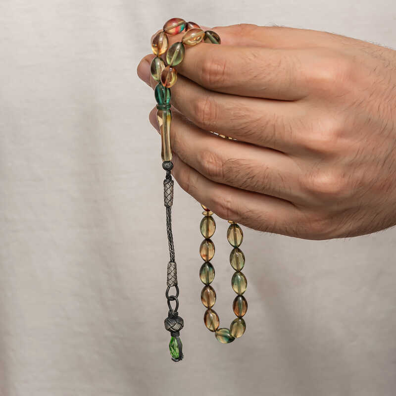 Kehribar, çam ağacı reçinesinin toprak altında uzun yıllar boyunca birikerek oluşan bir maddedir. Hemen hemen taş ile aynı sertliktedir fakat yoğunluğu düşüktür. Çam kokusu yayar. Oluşumu uzun zaman aldığından ve yapay olarak yapılamadığından değerli bir maddedir. Sıkma kehribar ise kehribar taşından farklı olarak onun özelliklerini taşıyan, görüntü itibariyle ona benzeyen fakat gerçek olmayan bir malzemedir. Ülkemizde ve dünyanın bir çok yerinde kehribar taşından çeşitli malzemeler üretilmiştir. Ülkemizde en yaygın olarak tesbih üretilmektedir. Kehribar tesbihler elde ısındıkça kehribar benzeri bir koku verir ve renk değiştirir. Bir çok rengi vardır. Hatta iki rengin birleşiminden oluşan kehribar tesbih modelleri de vardır. Genellikle gümüş püskül ile kullanılır veya sistemli olarak da kullanılabilir. Ülkemizin güzide tesbih ustaları bu malzemeyi sıklıkla işlemek suretiyle çeşitli sanat eserleri meydana getirirler. Bu tesbihler de koleksiyonerler tarafından alınıp satılmaktadır. Gümüş 1000 ayar kazaz püsküllü sıkma kehribar tesbih modeli de günlük hayatta kullanılabilecek çok şık bir tesbih çeşididir. Özel günlerin vazgeçilmez hediyesi sıkma kehribar tesbihler erkekler için doğum günü, sevgililer günü ve babalar günü gibi özel zamanlarda hediye olarak tercih edilebilir. Gümüş kazaz püsküllü sıkma kehribar tesbih modeli diğer kehribar tesbih modellerinde olduğu gibi tamamen el emeği ile imal edilmiştir.