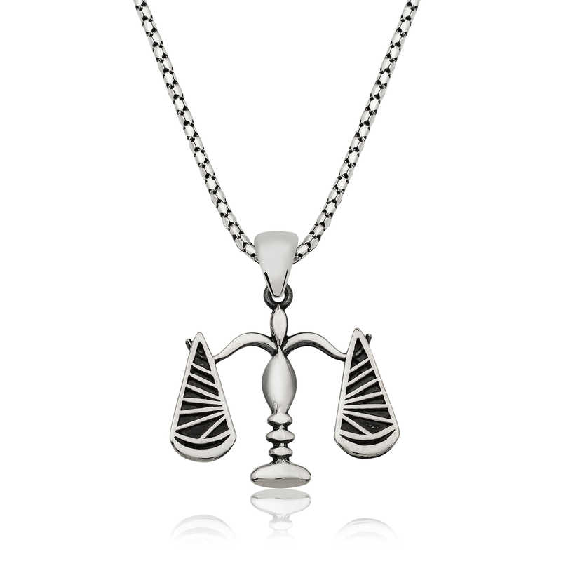 “Terazi” adaleti ve hakların dengeli şekilde dağıtılmasını sembolize eder. Adalet terazisi kolye; 925 ayar gümüşten imal edilmiştir. Gümüş üzerine oksit kaplama yapılmıştır. Oksit kaplama gümüşe eskitme görüntüsü verir. Zincir uzunluğu ortalama 55 cm"dr. Tüm kolyelerde olduğu gibi bu gümüş adalet terazisi kolye modeli de tamamen el emeği ile üretilmiştir.