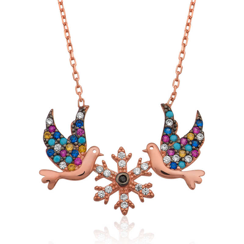 Kadınların boyunlarını ortaya çıkaran ve kıyafetlerini çok daha belirgin hale getiren kolyeler, aksesuarlar arasında vazgeçilmezler arasındadır. Gümüş aşk kuşları kolye yeni yıl, 14 Şubat sevgililer günü ve doğum günü gibi özel günlerde tercih edilebilecek en anlamlı hediye seçeneklerinden biridir. Kaliteli ve şık gümüş kolyeleri satın almak hayal olmaktan çıktı. 925 ayardan üretilen bu şık gümüş kolye üzerine rose altın kaplama yapılmıştır. Rose altın kaplama yapılan gümüş bayan kolyeler parlaklığını uzun süre muhafaza eder ve oksitlenmesi gecikir, gümüşe bakır rengini verir. Tüm kolyelerde olduğu gibi gümüş aşk kuşları kolye modeli de el emeği ile üretilmiştir. Gümüş ve değerli taşlar nedeniyle belirtilen ortalama ürün ağırlığında ± %10 sapma olabilmektedir.
