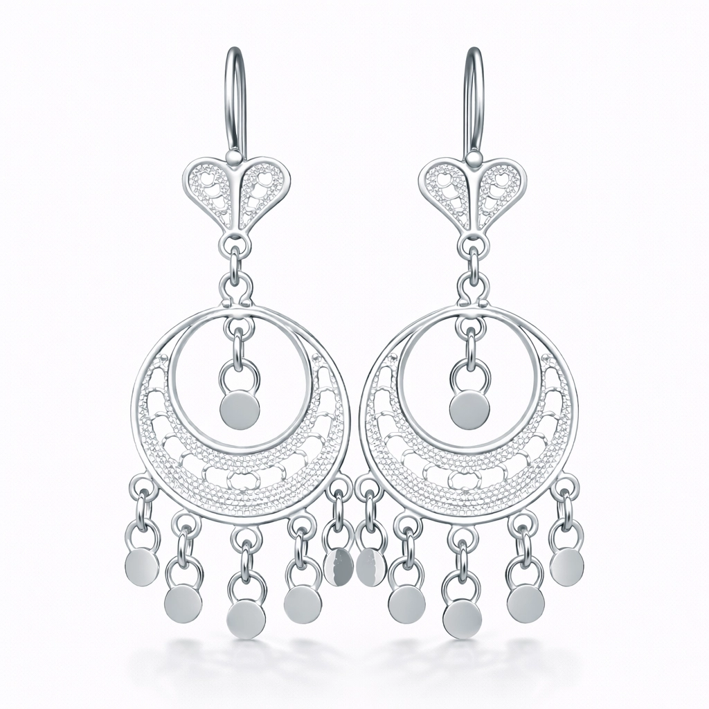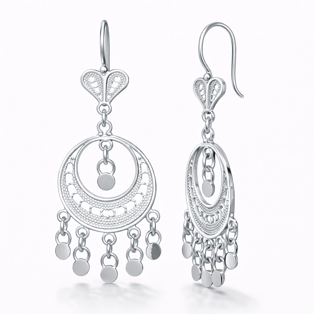Gümüşün zarafetini telkari sanatının ince işçiliğiyle buluşturan Gümüş Ay Dansı Telkari Kadın Küpe, her detayında el emeğinin güzelliğini taşıyan özel bir aksesuardır. Ay formunu andıran oyma motifleri ve alt kısımda yer alan zarif sallantılar, küpeye hem hareket hem de ışıltı katar.925 ayar gümüşten üretilen bu şık tasarım, günlük kombinlerden özel davetlere kadar her ortamda stilinizi öne çıkarır. Hafif yapısı sayesinde gün boyu rahatlıkla kullanılabilir. Geleneksel telkari dokusunu modern bir formda sunan bu küpe, hem kendiniz hem de sevdikleriniz için anlamlı ve zarif bir hediye seçeneğidir.Gümüş ve değerli taşlar nedeniyle belirtilen ortalama ürün ağırlığında ± %10 sapma olabilmektedir.