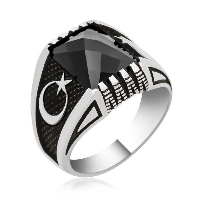 Türk bayrağının ilhamını da kan gölüne yansıyan ay ve yıldızdan aldığını biliyoruz. Bayrağın taşıdığı kutsal anlamı boynunuzda taşımak ve sevdiklerinizle paylaşmak için kaçırılmayacak bir fırsat sunuyoruz. Bu şık tasarım yüzüğü; kendinize yada sevdiklerinize doğum gününde, babalar gününde yada özel günlerde hediye edebilirsiniz. Ay yıldız erkek yüzük 925 ayar gümüşten imal edilmiştir. Gümüş üzerine oksit kaplama yapılmıştır. Oksit kaplama yapılan gümüş erkek yüzük modelleri otantik bir görünüme kavuşur, kararması gecikir. Üzerinde bulunan taş zirkondur. Tüm gümüş erkek yüzüklerinde olduğu gibi gümüş siyah zirkon taşlı ay yıldız erkek yüzük modeli de tamamen el emeği ile üretilmiştir. Gümüş ve değerli taşlar nedeniyle belirtilen ortalama ürün ağırlığında ± %10 sapma olabilmektedir.