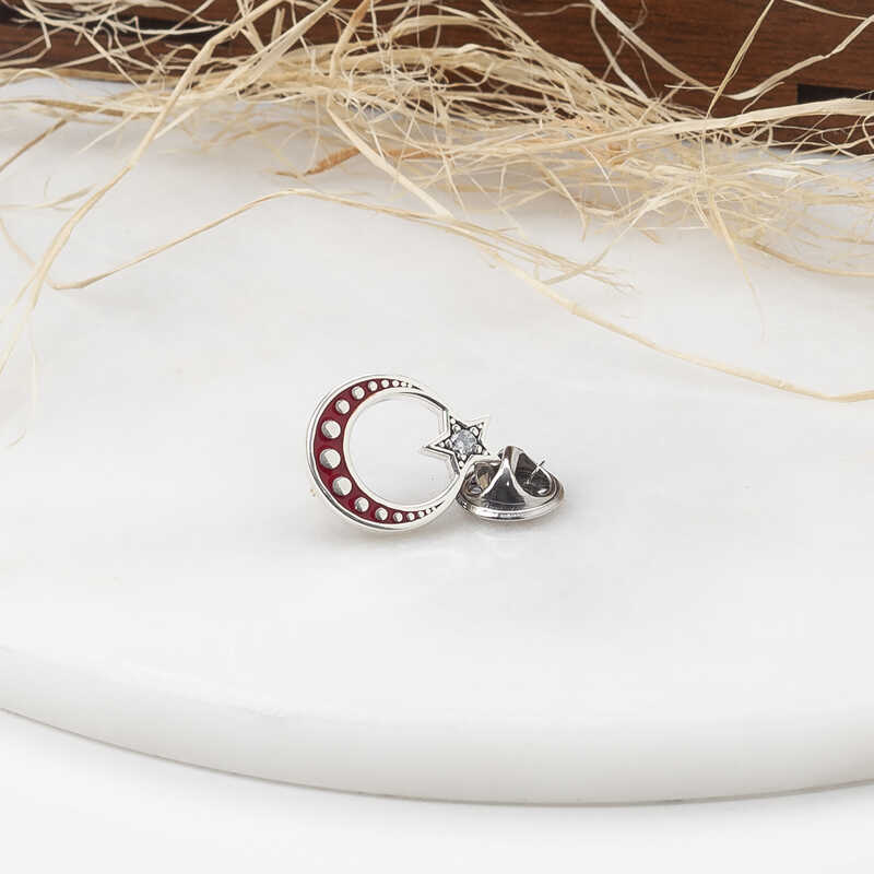 Türk bayrağının ilhamını kan gölüne yansıyan ay ve yıldızdan aldığını biliyoruz. Bayrağın taşıdığı kutsal anlamı taşımak ve sevdiklerinizle paylaşmak için kaçırılmayacak bir fırsat sunuyoruz. Bu şık rozet; doğum günü, babalar günü veya özel günlerde tercih edilebilecek mükemmel bir hediye seçeneğidir. Bu rozet modeli 925 ayar gümüşten imal edilmiştir. Gümüş üzerine rodyum kaplama yapılmıştır. Rodyum kaplama yapılan gümüş rozet modelleri parlaklığını uzun süre muhafa eder, oksitlenmesi gecikir. Tüm gümüş rozetlerde olduğu gibi gümüş ay yıldız rozet modeli de tamamen el emeği ile üretilmiştir. Gümüş ve değerli taşlar nedeniyle belirtilen ortalama ürün ağırlığında ± %10 sapma olabilmektedir.