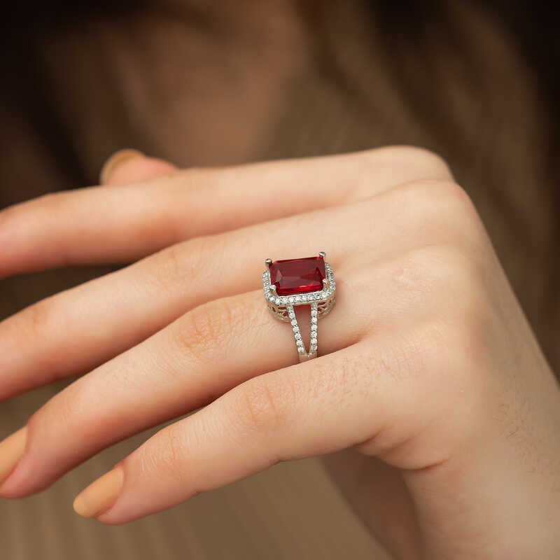 Gümüş Kırmızı Baget Kare Bayan Yüzük