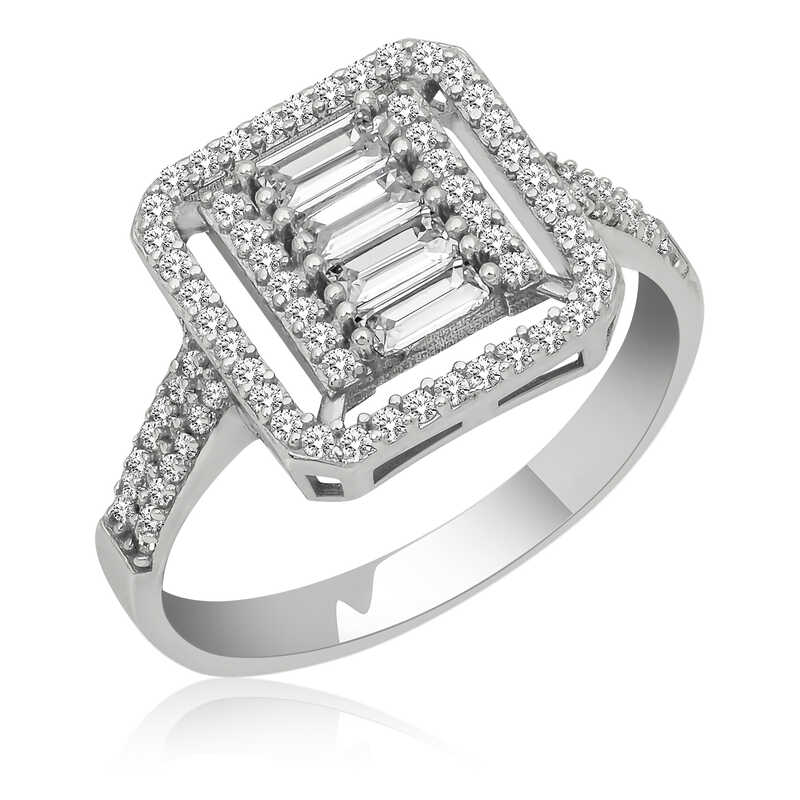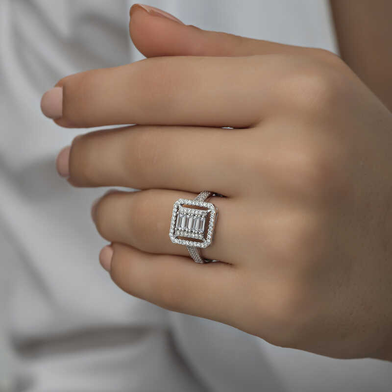 Günlük hayatta rahatlıkla kullanabileceğiniz bu özel tasarım baget kesim yüzük 925 ayar gümüşten imal edilmiştir. Gümüş üzerine rodyum kaplama yapılmıştır. Rodyum kaplama yapılan kadın gümüş yüzük modelleri parlaklığını uzun süre muhafaza eder, oksitlenmesi gecikir. Yüzük üzerinde bulunan taşlar zirkondur. Sevdiğinize doğum günü, sevgililer günü ve özel günlerde tercih edebileceğiniz mükemmel bir hediye seçeneğidir. Gümüş kadın yüzük modellerimizin tamamında olduğu gibi bu baget kesim kadın yüzük de tamamen el emeği ile üretilmiştir. Gümüş ve değerli taşlar nedeniyle belirtilen ortalama ürün ağırlığında ± %10 sapma olabilmektedir.
