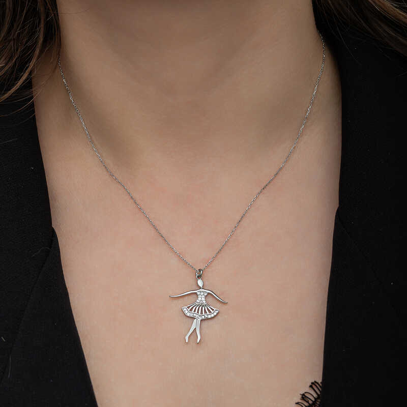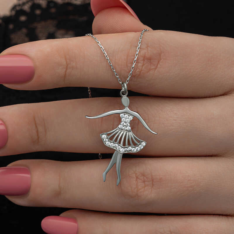 Balerinin en asil anlamlarından biri özgürlüğü simgelemesidir. Ruhun beden üzerindeki etkisini ve bu etkinin yarattığı büyük değişimleri simgeler. Bale; direkt ruhun sembolüdür, ruhun özgürlüğünü, hafifliğini ve zarafetini simgeler. Bu zariflikten yola çıkarak tasarladığımız bu şık kolye; doğum günü hediyesi, sevgililer günü hediyesi veya annelere hediye olarak özel günlerde tercih edilebilecek mükemmel bir seçenektir. Bu mükemmel kolye 925 ayar gümüşten imal edilmiştir. Gümüş üzerine rodyum kaplama yapılmıştır. Rodyum kaplama yapılan kolyeler parlaklığını uzun süre muhafaza eder, oksitlenmesi geciktirir. Üzerinde bulunan taşlar zirkondur. Zincir boyu ortalama 45 cm"dir. Tüm kolyelerde olduğu gibi gümüş balerin Kadın kolye de tamamı el emeği ile üretilmiştir. Gümüş ve değerli taşlar nedeniyle ürün ağırlığında ± %10 sapma olabilmektedir.