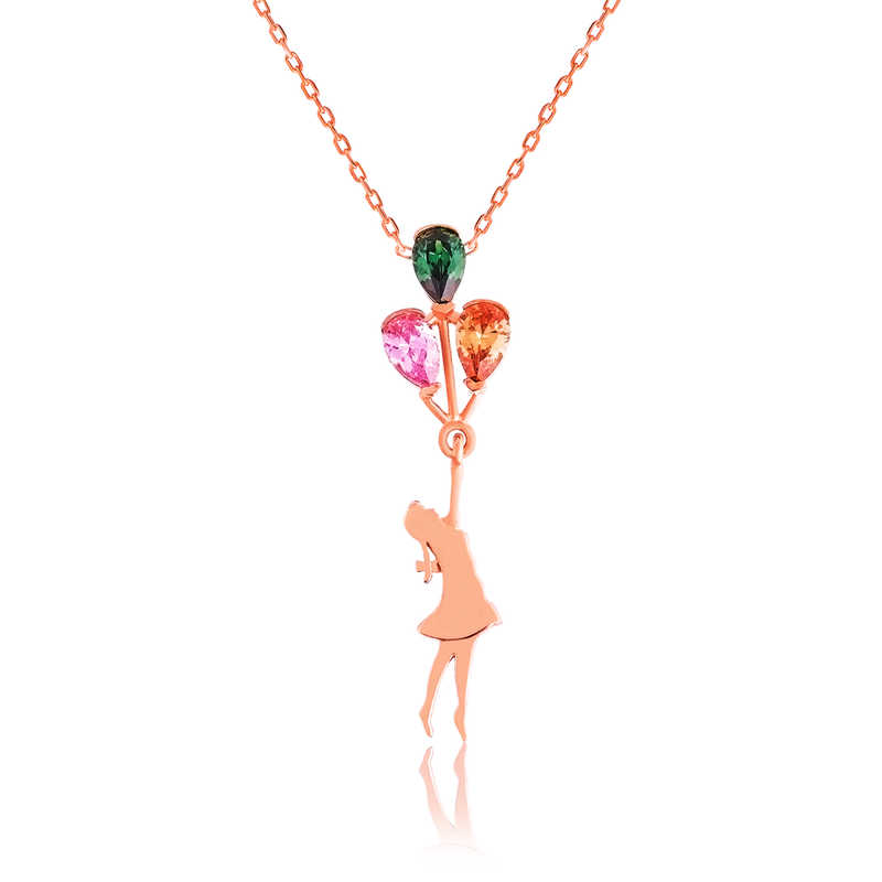 Düşlerimizi yansıtan rengarenk balonları ve rengarenk hayalleri tutan bu cıvıl cıvıl kızı sizler için tasarladık. Bu harika kolye; doğum günü hediyesi, sevgililer günü hediyesi veya anneler gününde hediye olarak özel günlerde tercih edilebilecek mükemmel bir seçenektir. Bu şık tasarım 925 ayar gümüşten imal edilmiştir. Bu kolye üzerinde rose kaplama yapılmıştır. Rose kaplama yapılan kolyeler parlaklığını uzun süre muhafaza eder, gümüş rengini pembe renge çevirir. Tüm gümüş bayan kolyelerde olduğu gibi gümüş balon tutan kız bayan kolye de el emeği ile üretilmiştir. Gümüş ve değerli taşlar nedeniyle belirtilen ürün ağırlığında ± %10 sapma olabilmektedir.