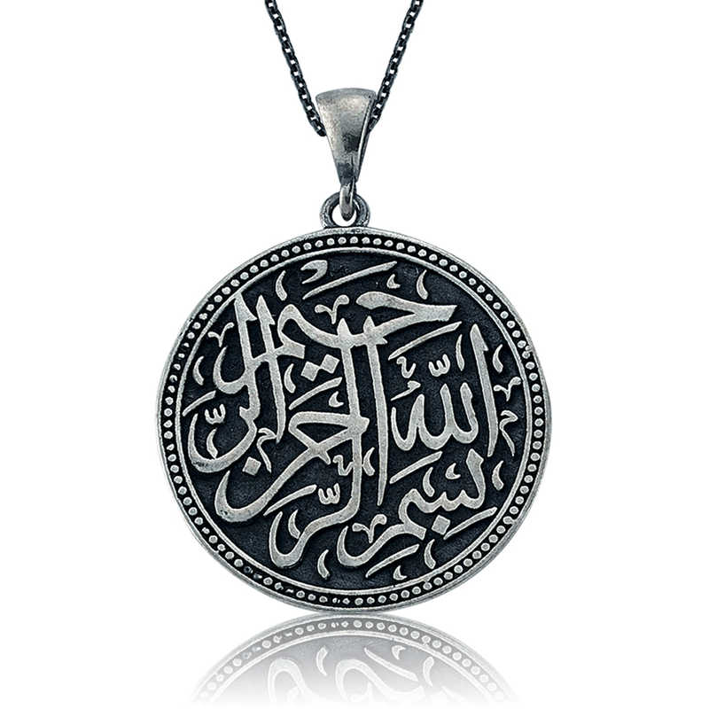 "Besmele" "Bismillâhirrahmânirrahîm"in kısaltılmış şeklidir. Hayırlı bir işe başlarken, Allah"ın ismini anarak işe başlamak mânâsına gelir. Besmele-i Şerif bayan kolye sizler için tasarlandı. Bu şık kolye modeli 925 ayar gümüşten imal edilmiştir. Gümüş üzerine oksit kaplama yapılmıştır. Oksit kaplama yapılan bayan kolyeler parlaklığını uzun süre muhafaza eder. Gümüş olan zincir uzunluğu 45 cm"dir. Tüm gümüş bayan kolyelerde olduğu gibi gümüş besmele-i şerif bayan kolye modeli de el emeği ile üretilmiştir. Gümüş ve değerli taşlar nedeniyle belirtilen ortalama ürün ağırlığında ± %10 sapma olabilmektedir.