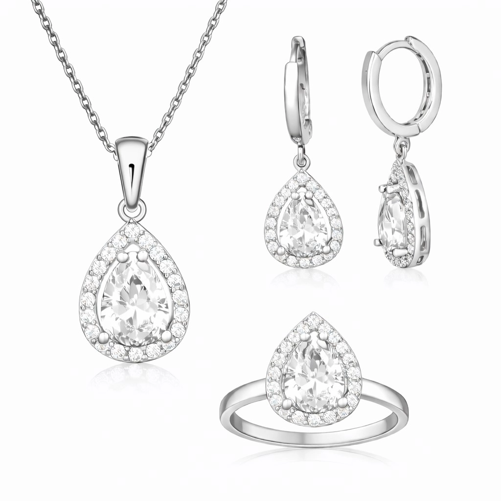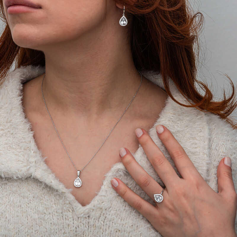 Gümüş Beyaz Zirkon Taşlı Damla Kadın Set