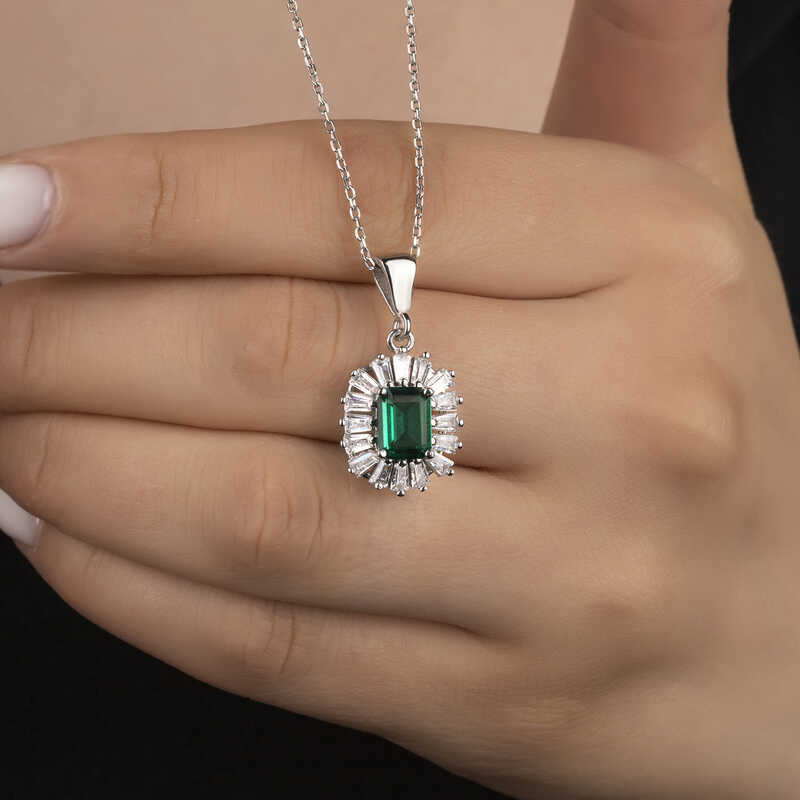 Gümüş Elmas Montür Zümrüt Taşlı Kadın Kolye