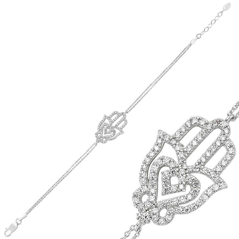 Her ne kadar Hz. Fatma"nın eli olarak bilinse de arapçada “hamse” diye anılır. Hamse, beş anlamına gelir ve bir elin parmak sayısını gösterir. Hz. Fatma bir gün mutfakta helva kavururken, eşi Hz. Ali görür ve pişen helvaya elini daldırır ancak hiçbir şey olmaz, helvayı böyle kavurmayı devam eder. O günden sonra elinin kutsallığına, gücüne adeta yenilmezliğine inanılır. Her güçlük adeta onun eliyle aşılacaktır. Bu harika tasarım Fatma eli bayan bileklik 925 ayar gümüşten imal edilmiştir. Bileklik üzerinde bulunan taşlar zirkondur. Tüm bayan bileklik modelinde olduğu gibi gümüş Fatma eli bayan bileklik de el emeği ile üretilmiştir. Gümüş ve değerli taşlar nedeniyle belirtilen ürün ağırlığında ± %10 sapma olabilmektedir.