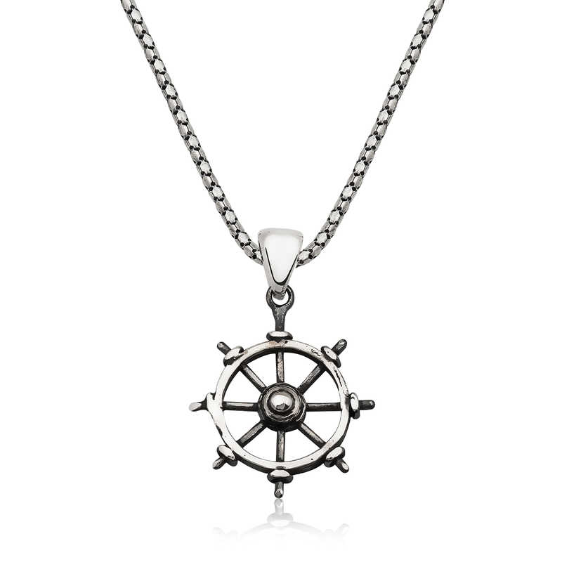 Denizcilikle uğraşmış ve deniz sevdasını yüreğinde barındıran kişilerin, kendilerini yansıtması için tercih edilebileceği aksesuarlardan biridir. Bazı inanışlara göre kalbi kırılmış ve umudunu yitirmiş kişiler kendilerini yeni bir hayata başlatmak için gemi dümeni figürünü kullanmışlardır. Estetik açıdan da severek kullanılabileceğiniz, sevdiklerinize hediye edebileceğiniz bir modeldir. 925 ayar gümüşten imal edilmiştir. Gümüş üzerine oksit kaplama yapılmıştır. Oksit kaplama yapılan gümüş kolye modelleri parlaklığını uzun süre muhafaza eder ve oksitlenmesi gecikir. Gümüş olan zincir boyu ortalama 55 cm"dir. Bu gemi dümeni kolye de diğer gümüş kolye modellerinde olduğu gibi el emeği ile üretilmiştir. Gümüş ve değerli taşlar nedeniyle belirtilen ortalama ürün ağırlığında ± %10 sapma olabilmektedir.