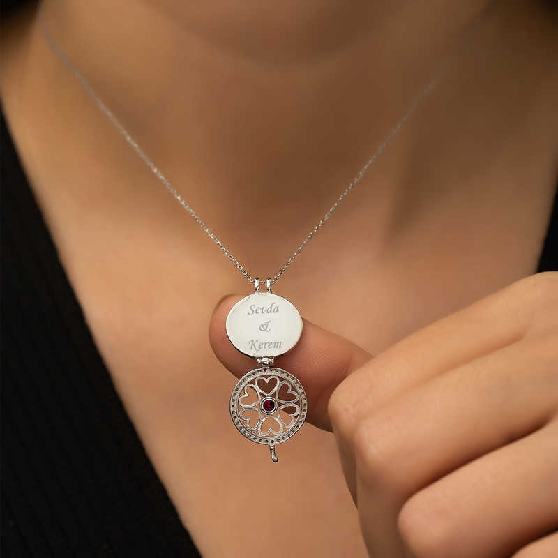 Sevgilinize duyduğunuz aşkınızı ve ilk anki mutluluğunuzu her an hatırlatabileceğiniz, en romantik anlarınıza eşlik edecek kalp çemberi içerisinde isimlerinizin yazılı olduğu gizli aşk kolye uzun bir birliktelik beklediğiniz sevdiğinize verebileceğiniz en anlamlı hediyelerden biri olacaktır. Kalp çemberinin içerisinde isimlerinizin yazılı olduğu kişiye özel bayan kolye 925 ayar gümüşten imal edilmiştir. Gümüş üzerine rodyum kaplama yapılmıştır. Rodyum kaplama yapılan gümüş bayan kolye modelleri parlaklığını uzun süre muhafaza eder ve oksitlenmesi gecikir. Kolye üzerinde bulunan taşlar zirkondur. Zincir boyu ortalama 45 cm"dir. Bu özel tasarım gizli aşk bayan kolye el emeği ile üretilmiştir. Gümüş ve değerli taşlar nedeniyle ürün ağırlığında ± %10 sapma olabilmektedir.