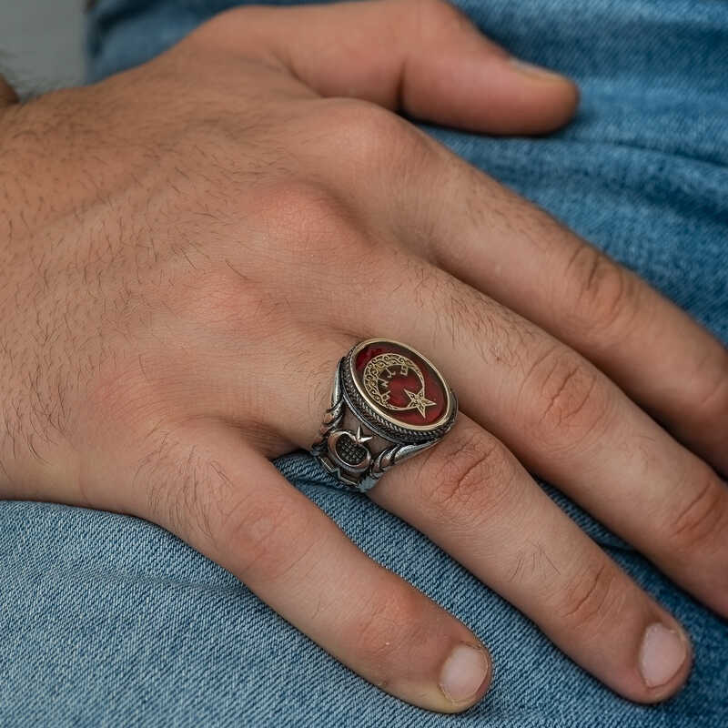 Hilal ve yıldız ya da ay-yıldız; hilal ve hilalin açık ucunda yer alan bir yıldız şeklinden oluşan antik sembol. Bu sembolün kullanıldığı bayraklara çoğunlukla Akdeniz civarında, Orta Doğu ve Orta Asya"da rastlanır. Günümüzde çoğunlukla İslam ülkelerinin bayraklarında kullanılan bir sembol olarak bilinmektedir. Ay- Yıldız simgesi, Türk Bayrağı dahil bir çok bayrakta yer almaktadır. Ay ya da Hilâl, İslâm dini ile özdeşleşmesine rağmen, İslâm öncesi dönemlerde de kullanılmıştır. Ay- Yıldız ve Güneş motifleri, Asyalı Türk- Moğol halklarının evren tasarımı hakkında bilgiler sunar. Fakat Ay ile Yıldız’ın birlikte tasvir edildiği ilk belgeler Mezopotamya’da bugünkü Güney Irak’taki Sümer şehirlerinde ortaya çıkmıştır. Tarihte bariz şekilde hilâlden oluşan Ay-Yıldız motifini ilk kez Sümerler kullanmıştır. Sümerler, İÖ. 3 000’de Güney Irak’ta tarihin ilk devletini kurmuşlar ve bugünkü medeniyetin inşasında çok büyük adım atmışlardı. Sümer dili Türkçe’ye oldukça yakın bir dildi. İnançları da Türkler’e büyük ölçüde benzer bir yapıdaydı. Sümer Ay Tanrısı “Nana- Suen” ve Güneş Tanrısı “Utu” veya Tanrıça İnana’nın sembolleri bir arada gösterilerek ilk Hilâl-Yıldız ikilemesi yapılmış oldu. Bu motif bazen taş kabartmalarda, bazen mühürlerde bazen de kil tabletlerde işlenmiş ve günümüze kadar ulaşmıştır. Bu şık yüzüğü; doğum günü hediyesi, sevgililer günü hediyesi olarak özel günlerde tercih edebilirsiniz. Gümüş göktürçe türk yazılı ay yıldız yüzük 925 ayar gümüşten imal edilmiştir. Gümüş üzerine oksit kaplama yapılmıştır. Oksit kaplama yapılan gümüş yüzükler eskitme görünme sahip olurlar. Ay yıldız üzeri kırmızı polyester kaplamadır. Gümüş ve değerli taşlar nedeniyle belirtilen ortalama ürün ağırlığında ± %10 sapma olabilmektedir.