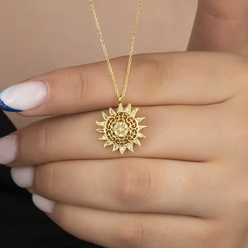 Güneş; ışığın, bilginin, iyiliğin, gücün ve yönetimin sembolüdür. Bu ışıl ışıl ve farklı tasarımıyla göz kamaştıran kolye; 925 ayar gümüşten imal edilmiştir. Gümüş üzerine gold kaplama yapılmıştır. Gold kaplama yapılan gümüş ürünler parlaklığını uzun süre muhafaza eder, oksitlenmesi gecikir. Gümüş beyaz taşlı güneş kadın kolye üzerinde bulunan taşlar zirkon"dur. Tüm gümüş kolyelerde olduğu gibi gümüş güneş kadın kolye de tamamı el emeği ile üretilmiştir. Gümüş ve değerli taşlar nedeniyle belirtilen ortalama ürün ağırlığında ± %10 sapma olabilmektedir.