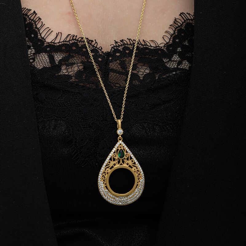 Damla form deseniyle şıklığı ifade eden gümüş çeyrek takılabilen altın kadın kolye modeli ile sevginiz, sevdiğiniz kadının teninde hayat bulsun. Genç sevgililerin ve kendini genç hissedenlerin özel günlerde de seçebileceği bu kadın kolye modeli ile sevdiğinizin bileğini aşkla süsleyin. Sizin olduğu kadar sevdiklerinizin de keyifle takacağı kadın kolye sevdiğinize en güzel hediyelerden biri olacaktır. Bu kadın kolye modeli 925 ayar gümüşten imal edilmiştir. Gümüş üzerine altın kaplama yapılmıştır. Altın kaplama yapılan gümüş kadın kolye modelleri parlaklığını uzun süre muhafaza eder ve oksitlenmesi gecikir. kolye üzerinde bulunan beyaz taşlar zirkondur. Tüm kadın kolye modellerinde olduğu gibi gümüş kadın kolye modeli de el emeği ile üretilmiştir. Gümüş ve değerli taşlar nedeniyle belirtilen ortalama ürün ağırlığında ± %10 sapma olabilmektedir.