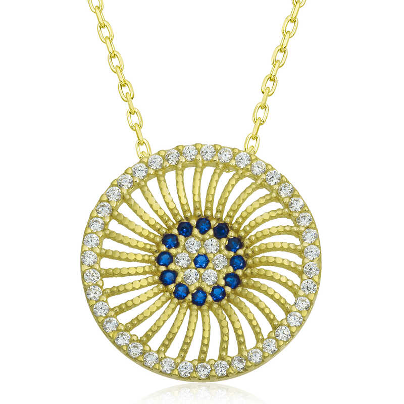 Birçok kültürde kötü enerjinin zararlarından korunmak için çeşitli tılsımlar kullanılmıştır. Doğu kültürlerinin çoğunda kullanılan tılsım ise gözdür. Nazar boncuğu da göz şeklinden ilhamla tasarlanmıştır. Mavi rengin seçilmesi de tesadüf değildir. Renkli gözlü kişilerin enerjisini daha etkili yansıttığı inancı gereği nazar boncukları çoğunlukla mavi olarak tasarlanır. Güzelliğiyle göz kamaştıran, nazardan korunmasını istediğiniz kişilere ve sevdiklerinize nazar kolyeyi armağan edebilirsiniz. Nazar kadın kolye modeli 925 ayar gümüşten imal edilmiştir. Gümüş üzerine gold kaplama yapılmıştır. Gold kaplama yapılan gümüş nazar kolye modelleri parlaklığını uzun süre muhafaza eder ve oksitlenmesi gecikir. Kolye üzerinde bulunan taşlar zirkon"dur. Bu nazar kadın kolye modeli diğer tüm gümüş kadın kolye modellerinde olduğu gibi el emeği ile üretilmiştir. Gümüş ve değerli taşlar nedeniyle belirtilen ortalama ürün ağırlığında ± %10 sapma olabilmektedir.