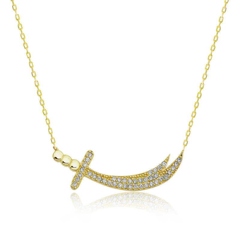 Tarihçilere göre Mısır Melik"i Mukavkas bu kılıcı Hz. Muhammed"e hediye etmiştir. Amrû bin Adûd, savaşta kendisine karşı çıkacak bir savaşçı istediğinde Peygamber, Ali"ye bu kılıcı uzatarak onun karşısına çıkmasına izin vermiştir. Hz. Ali"nin Uhud savaşında Kureyş’in önde gelen savaşçılarından dokuz kişiyi öldürdüğü, bu savaşta bedeninden yetmiş yara alarak son ana kadar Hz. Muhammed"i savunduğu, bu sebeple de Cebrail"in, “Zülfikar"dan keskin kılıç, Ali’den büyük yiğit yoktur.” "Lâ fetâ illâ Ali, lâ seyfe illâ Zülfikâr" dediği rivayet edilir. Ali"nin vasiyeti üzerine Necef"te denize atıldığı belirtilmiştir. Zülfikar kılıcı kadın kolye modeli 925 ayar gümüşten imal edilmiştir. Gümüş üzerine gold kaplama yapılmıştır. Gold kaplama yapılan gümüş kadın kolye modelleri parlaklığını uzun süre muhafaza eder. Ürünlerimizin tamamında olduğu gibi gümüş zülfikar kılıcı kadın kolye modeli de el emeği ile üretilmiştir. Gümüş ve değerli taşlar nedeniyle belirtilen ortalama ürün ağırlığında ± %10 sapma olabilmektedir.