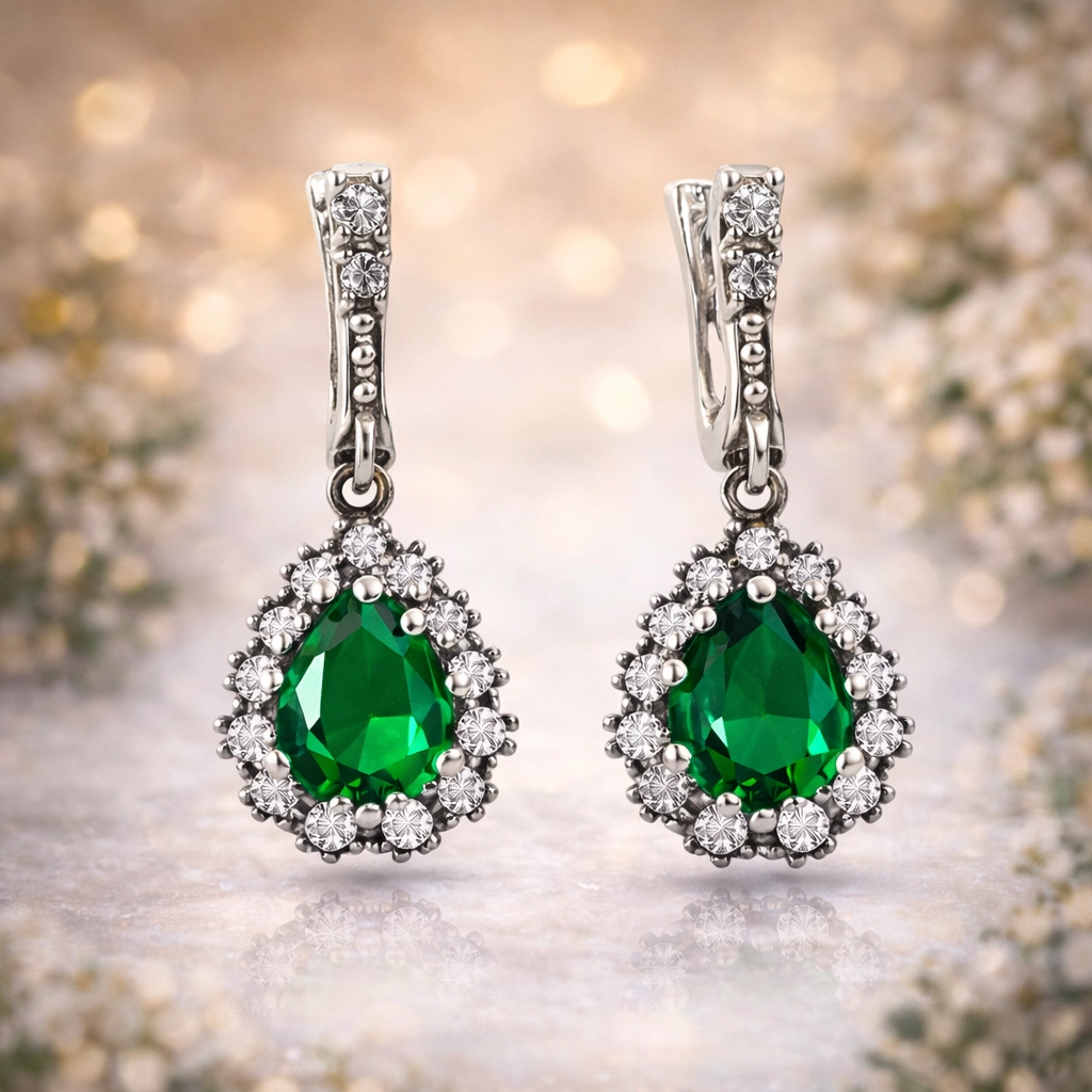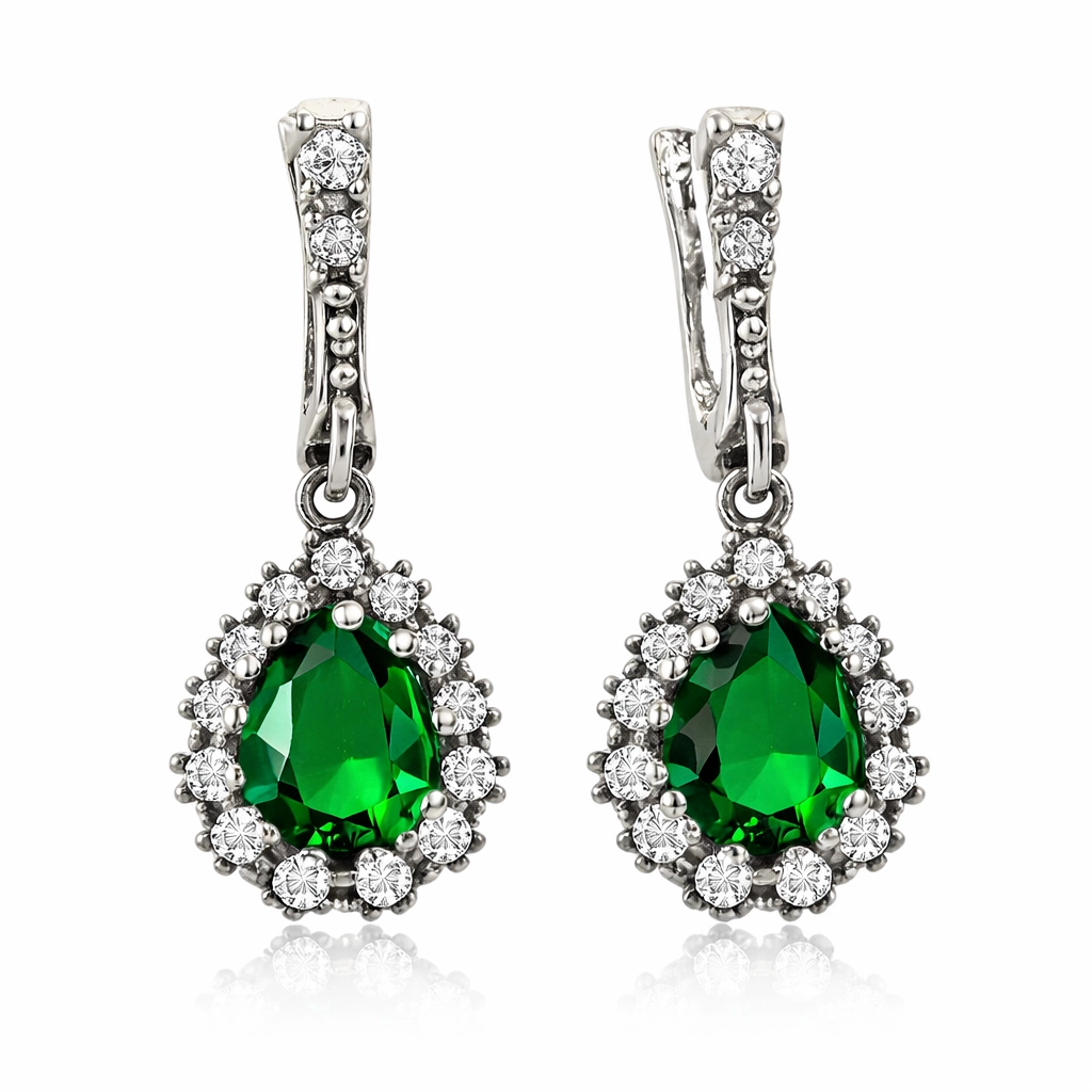 Gümüş ve zümrüt yeşili zirkon taşın ışıltısı dünyanıza renk katacak ve yaşam enerjinizi artıracak. Hürrem Sultan’ın da en beğendiği takılardan olan yeşil damla taşlı bu küpe modeli 925 ayar gümüşten imal edilmiştir. Bu özel tasarım küpe üzerinde bulunan taşlar zirkondur. Gümüş Hürrem Sultan bayan küpe üzerine oksit kaplama yapılmıştır. Oksit ile kaplanan tüm gümüş bayan set modelleri antik bir görünüme kavuşur. Sizin olduğu kadar sevdiklerinizin de keyifle takacağı bu set, aynı zamanda sevginizi paylaşabileceğiniz çok şık bir hediye seçeneğidir. Tüm bayan gümüş küpe modellerimizde olduğu gibi gümüş Hürrem Sultan bayan küpe modeli de el emeği ile üretilmiştir. Gümüş ve değerli taşlar nedeniyle belirtilen ortalama ürün ağırlığında ± %10 sapma olabilmektedir.