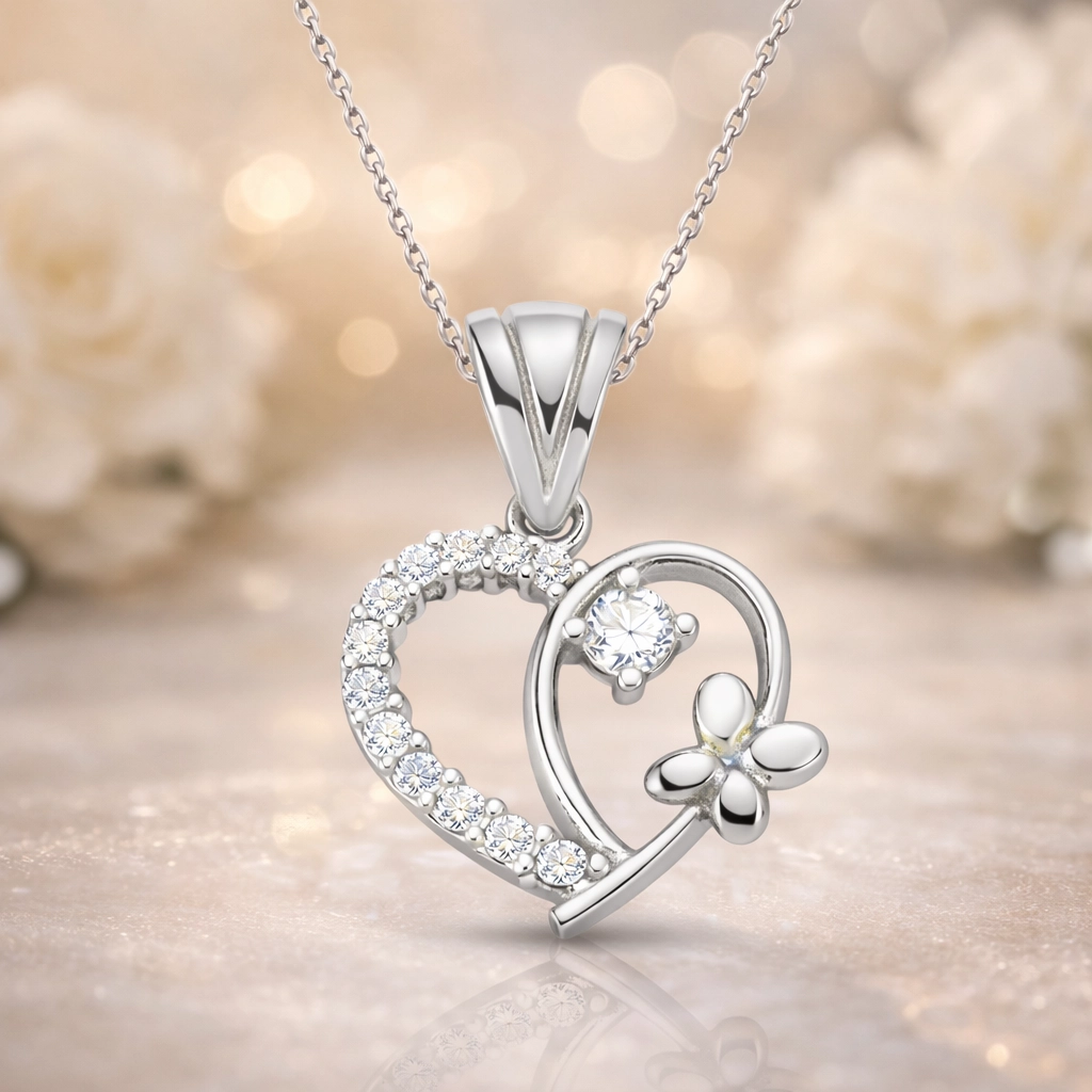 Bu çiçek desenli kalpli kolye modeli 925 ayar gümüşten imal edilmiştir. Gümüş üzerine rodyum kaplama yapılmıştır.Rodyum kaplama yapılan ürünler parlaklığını uzun süre muhafaza eder, oksitlenmesi gecikir. Kolye ile birlikte gelecek gümüş olan zincir Uzunluğu 45 cm’dir. Tüm bayan kolye modellerinde olduğu gibi gümüş kalpli bayan kolye modeli de el emeği ile üretilmiştir. Gümüş ve değerli taşlar nedeniyle belirtilen ortalama ürün ağırlığında ± %10 sapma olabilmektedir.