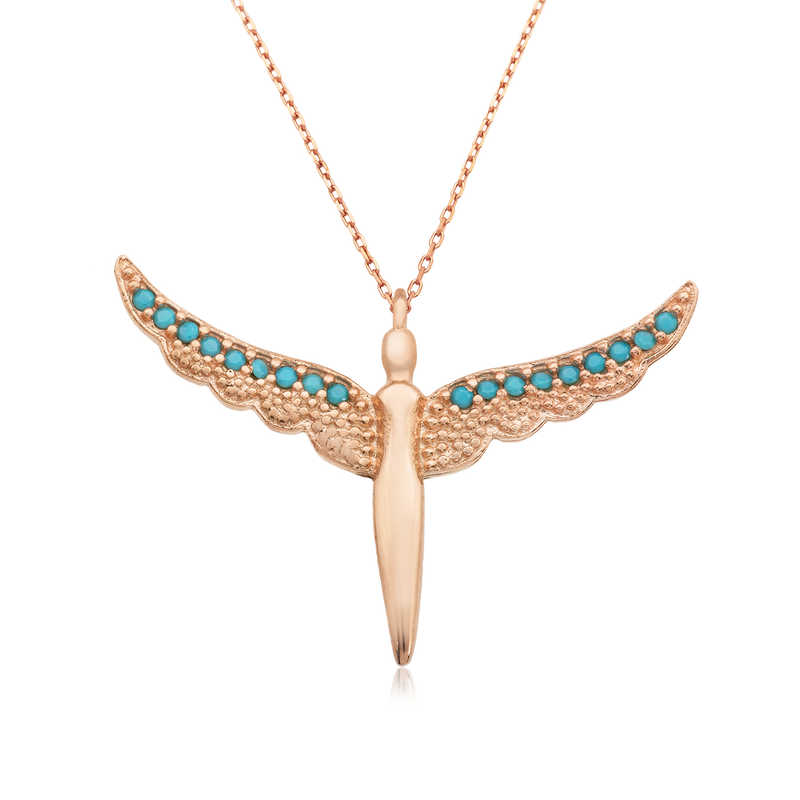 Melekler saflığın ve temizliğin simgeleridir. Bu nedenle melek kolye hediye edilen kişiye melek kadar saf ve temiz olduğu mesajı verilmektedir… Aşkınızı meleklerin koruması için tasarlanan bu özel kanatlı melek bayan kolyeyi sevgilinize; doğum günü, sevgililer günü ve özel günlerde hediye ederek onları mutlu edebilirsiniz. Kolye; 925 ayar gümüşten imal edilmiştir. Gümüş melek bayan kolye üzerine rose kaplama yapılmıştır. Rose kaplama yapılan tüm kolyeler parlaklığını uzun süre muhafaza eder, gümüşe pembe rengi verir. Tüm gümüş kolyelerde olduğu gibi bu gümüş kanatlı melek bayan kolye de el emeği ile üretilmiştir. Gümüş ve değerli taşlar nedeniyle ürün ağırlığında ± %10 sapma olabilmektedir.