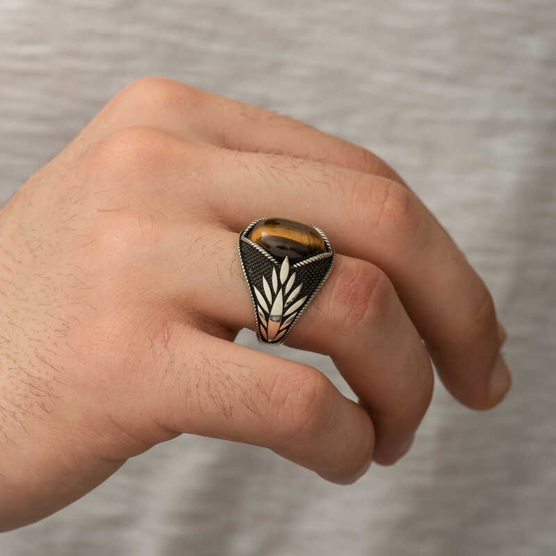 Kaplan gözü, Kristal Kuvars’ın bir alt türü olan Kalsedon grubuna bağlı bir değerli taştır. Adını, kaplanın gözlerine benzeyen kendine özgü renk tonlarından alır. Altınımsı ya da bal rengi olarak tanımlanan çizgisel tonları vardır. Yanardöner ve ipeğimsi görünüşü kaplan gözünü eşsiz kılan özelliklerinden biridir. “Sevgililerin taşı” olarak da tanımlanan kaplan gözü, duygulara hitap eden bir taştır. Değerli taşlar arasında, “koruyucu” özelliği ile en çok öne çıkanlardan biridir. Kullananın hareketlerine veya ruhsal durumuna göre renk değiştirmesi de bilinen özelliklerinden biridir. Bu şık yüzüğü; kendinize yada sevdiklerinize doğum gününde, babalar gününde ya da özel günlerde tercih edebilirsiniz. Bu şık yüzük 925 ayar gümüşten imal edilmiştir. Gümüş üzerine oksit kaplama yapılmıştır. Oksit kaplama yapılan yüzükler otantik bir görünüme kavuşur. Tüm erkek yüzüklerde olduğu gibi gümüş kaplan gözü taşlı işlemeli erkek yüzük modeli de el emeği ile üretilmiştir. Gümüş ve değerli taşlar nedeniyle belirtilen ortalama ürün ağırlığında ± %10 sapma olabilmektedir.
