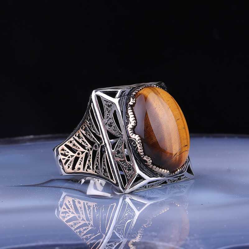 Gümüş Kaplan Gözü Taşlı Kare Erkek Yüzük