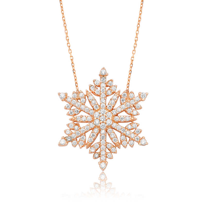 Her kar tanesinden aslında sadece bir tane var. Sevdiğiniz kişiye hediye ettiğiniz kar tanesi kolye ile onun sizin için eşsiz ve biricik olduğunu sessizce dillendirmiş oluyorsunuz. Sizlerde her zevke uygun gümüş kar tanesi bayan kolye modeli ile şıklığınıza ışıltı katın. Kar tanesi bayan kolye 925 ayar gümüşten imal edilmiştir. Gümüş üzerine rose altın kaplama yapılmıştır. Rose altın kaplama yapılan gümüş bayan kolye modelleri parlaklığını uzun süre muhafaza eder ve oksitlenmesi gecikir. Kolye üzerinde bulunan beyaz taşlar zirkondur. Gümüş olan zincir boyu ortalama 45 cm"dir. Gümüş kar tanesi bayan kolye modeli diğer kar tanesi bayan kolye modelleri gibi el emeği ile üretilmiştir. Gümüş ve değerli taşlar belirtilen nedeniyle ürün ağırlığında ± %10 sapma olabilmektedir.
