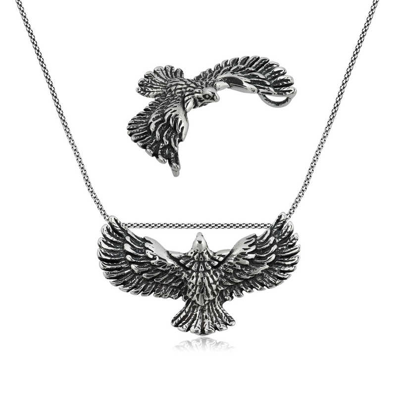 Kuşların kralı olan ve savaşmak üzere dünyaya inen kartal, özellikle savaşçı ve güçlü olmasıyla tanınır; bu yüzden pek çok ulusun sembolü olmuştur. Bu derin anlamdan esinlenerek oluşturulan kartal erkek kolye modeli kendinize ya da sevdiklerinize doğum gününde, babalar gününde ve özel günlerde hediye edebilirsiniz. Bu şık erkek kolye modeli 925 ayar gümüşten imal edilmiştir. Gümüş üzerine oksit kaplama yapılmıştır. Oksit kaplama yapılan ürünler siyah eskitme bir hal alır. Tüm erkek kolye modellerinde olduğu gibi gümüş kartal erkek kolye modeli de el emeği ile üretilmiştir. Gümüş ve değerli taşlar nedeniyle ürün ağırlığında ± %10 sapma olabilmektedir.
