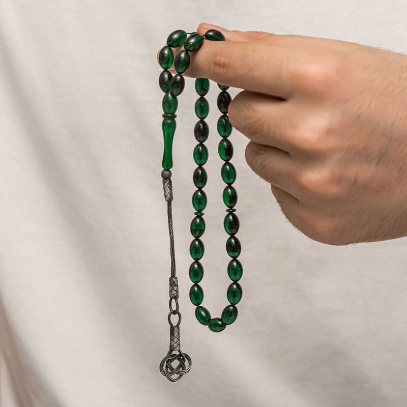 Kehribar, çam ağacı reçinesinin toprak altında uzun yıllar boyunca birikerek oluşan bir maddedir. Hemen hemen taş ile aynı sertliktedir fakat yoğunluğu düşüktür. Çam kokusu yayar. Oluşumu uzun zaman aldığından ve yapay olarak yapılamadığından değerli bir maddedir. Sıkma kehribar ise kehribar taşından farklı olarak onun özelliklerini taşıyan, görüntü itibariyle ona benzeyen fakat gerçek olmayan bir malzemedir. Ülkemizde ve dünyanın bir çok yerinde kehribar taşından çeşitli malzemeler üretilmiştir. Ülkemizde en yaygın olarak tesbih üretilmektedir. Kehribar tesbihler elde ısındıkça kehribar benzeri bir koku verir ve renk değiştirir. Bir çok rengi vardır. Hatta iki rengin birleşiminden oluşan kehribar tesbih modelleri de vardır. Genellikle gümüş püskül ile kullanılır veya sistemli olarak da kullanılabilir. Ülkemizin güzide tesbih ustaları bu malzemeyi sıklıkla işlemek suretiyle çeşitli sanat eserleri meydana getirirler. Bu tesbihler de koleksiyonerler tarafından alınıp satılmaktadır. Gümüş 1000 ayar kazaz püsküllü sıkma kehribar tesbih modeli de günlük hayatta kullanılabilecek çok şık bir tesbih çeşididir. Özel günlerin vazgeçilmez hediyesi sıkma kehribar tesbihler erkekler için doğum günü, sevgililer günü ve babalar günü gibi özel zamanlarda hediye olarak tercih edilebilir. Gümüş kazaz püsküllü sıkma kehribar tesbih modeli diğer kehribar tesbih modellerinde olduğu gibi tamamen el emeği ile imal edilmiştir.