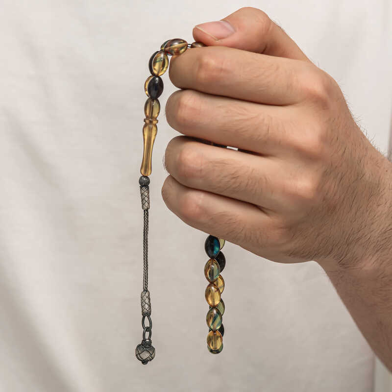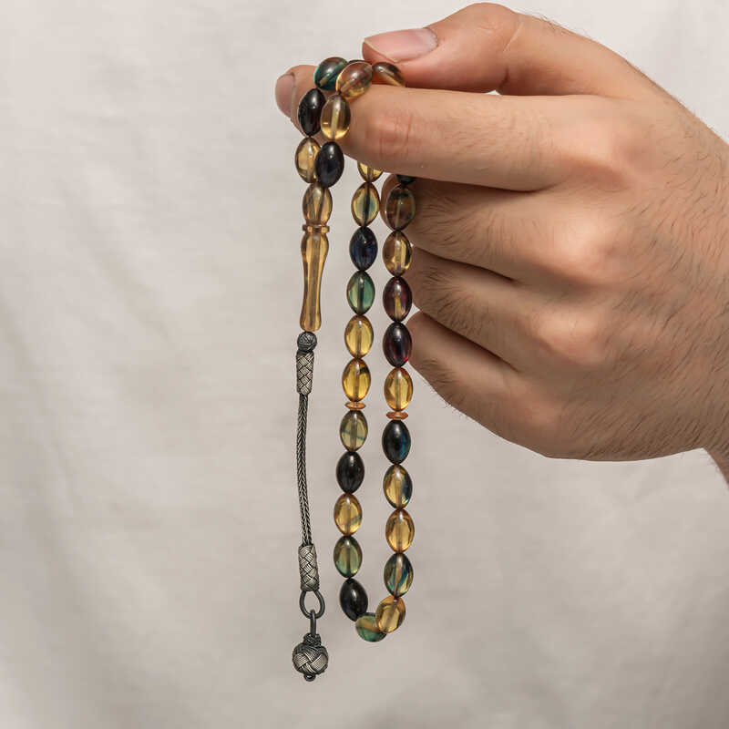 Kehribar, çam ağacı reçinesinin toprak altında uzun yıllar boyunca birikerek oluşan bir maddedir. Hemen hemen taş ile aynı sertliktedir fakat yoğunluğu düşüktür. Çam kokusu yayar. Oluşumu uzun zaman aldığından ve yapay olarak yapılamadığından değerli bir maddedir. Sıkma kehribar ise kehribar taşından farklı olarak onun özelliklerini taşıyan, görüntü itibariyle ona benzeyen fakat gerçek olmayan bir malzemedir. Ülkemizde ve dünyanın bir çok yerinde kehribar taşından çeşitli malzemeler üretilmiştir. Ülkemizde en yaygın olarak tesbih üretilmektedir. Kehribar tesbihler elde ısındıkça kehribar benzeri bir koku verir ve renk değiştirir. Bir çok rengi vardır. Hatta iki rengin birleşiminden oluşan kehribar tesbih modelleri de vardır. Genellikle gümüş püskül ile kullanılır veya sistemli olarak da kullanılabilir. Ülkemizin güzide tesbih ustaları bu malzemeyi sıklıkla işlemek suretiyle çeşitli sanat eserleri meydana getirirler. Bu tesbihler de koleksiyonerler tarafından alınıp satılmaktadır. Gümüş 1000 ayar kazaz püsküllü sıkma kehribar tesbih modeli de günlük hayatta kullanılabilecek çok şık bir tesbih çeşididir. Özel günlerin vazgeçilmez hediyesi sıkma kehribar tesbihler erkekler için doğum günü, sevgililer günü ve babalar günü gibi özel zamanlarda hediye olarak tercih edilebilir. Gümüş kazaz püsküllü sıkma kehribar tesbih modeli diğer kehribar tesbih modellerinde olduğu gibi tamamen el emeği ile imal edilmiştir.