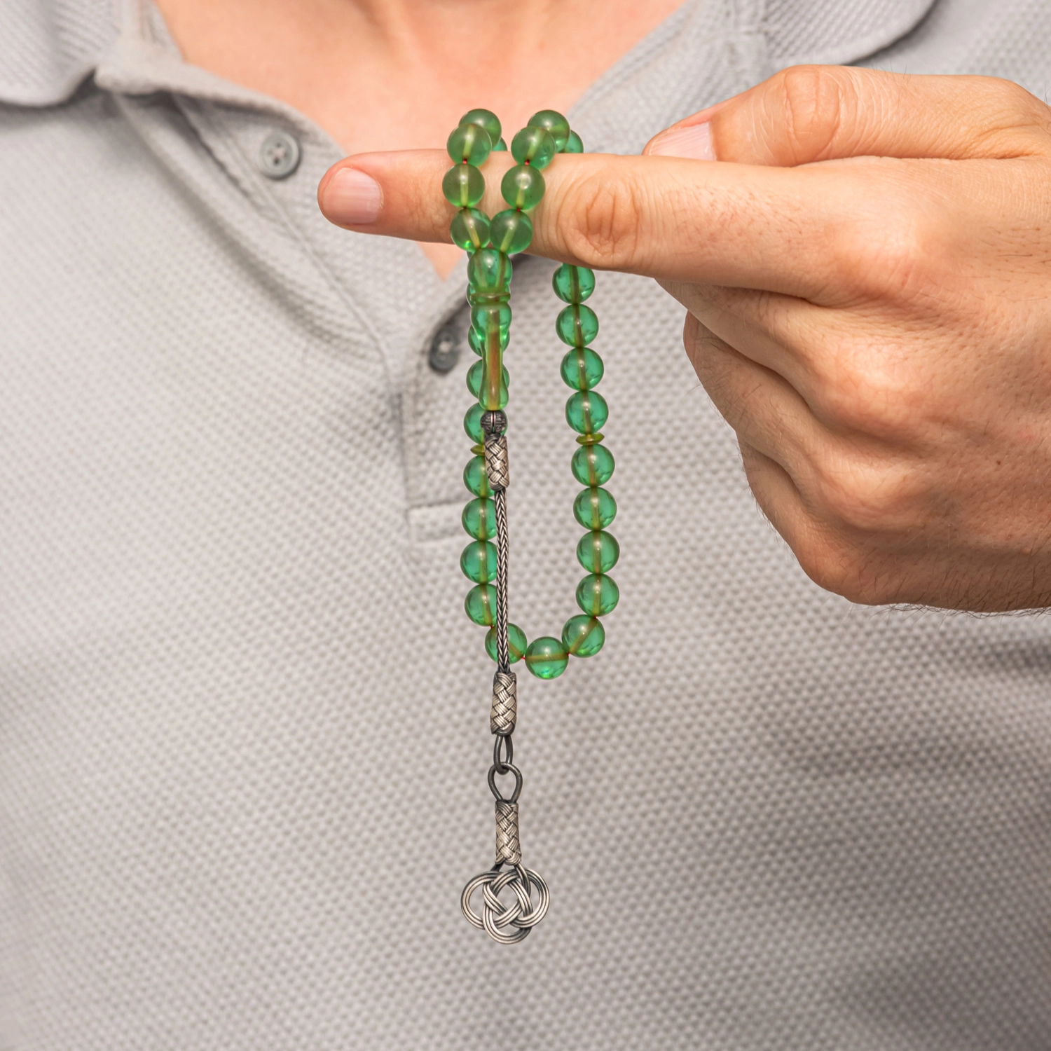Zarif işçiligi ve klasik duruşuyla öne çıkan bu Yeşil Sıkma Kehribar Tesbih, geleneksel tesbih sanatının modern bir yorumudur. Canlı yeşil tonlara sahip yuvarlak kesim taneleri, elde rahat bir kullanım sunarken estetik görünümüyle de dikkat çeker. Tesbihin en özel detaylarından biri, el işçiliği gümüş kazaz püskülüdür. Kazaz tekniğiyle örülmüş püskül, tesbihe hem değer hem de şıklık katar. Dengeli ağırlığı ve akıcı dizilimi sayesinde günlük kullanımda veya koleksiyonluk olarak tercih edilebilir.Geleneksel tesbih severler için estetik, kaliteli ve özenle hazırlanmış bir seçenektir. Şıklığı ve işçiliği bir arada arayanlara hitap eder. Gümüş ve değerli taşlar nedeniyle belirtilen ürün ağırlığında ± %10 sapma olabilmektedir.