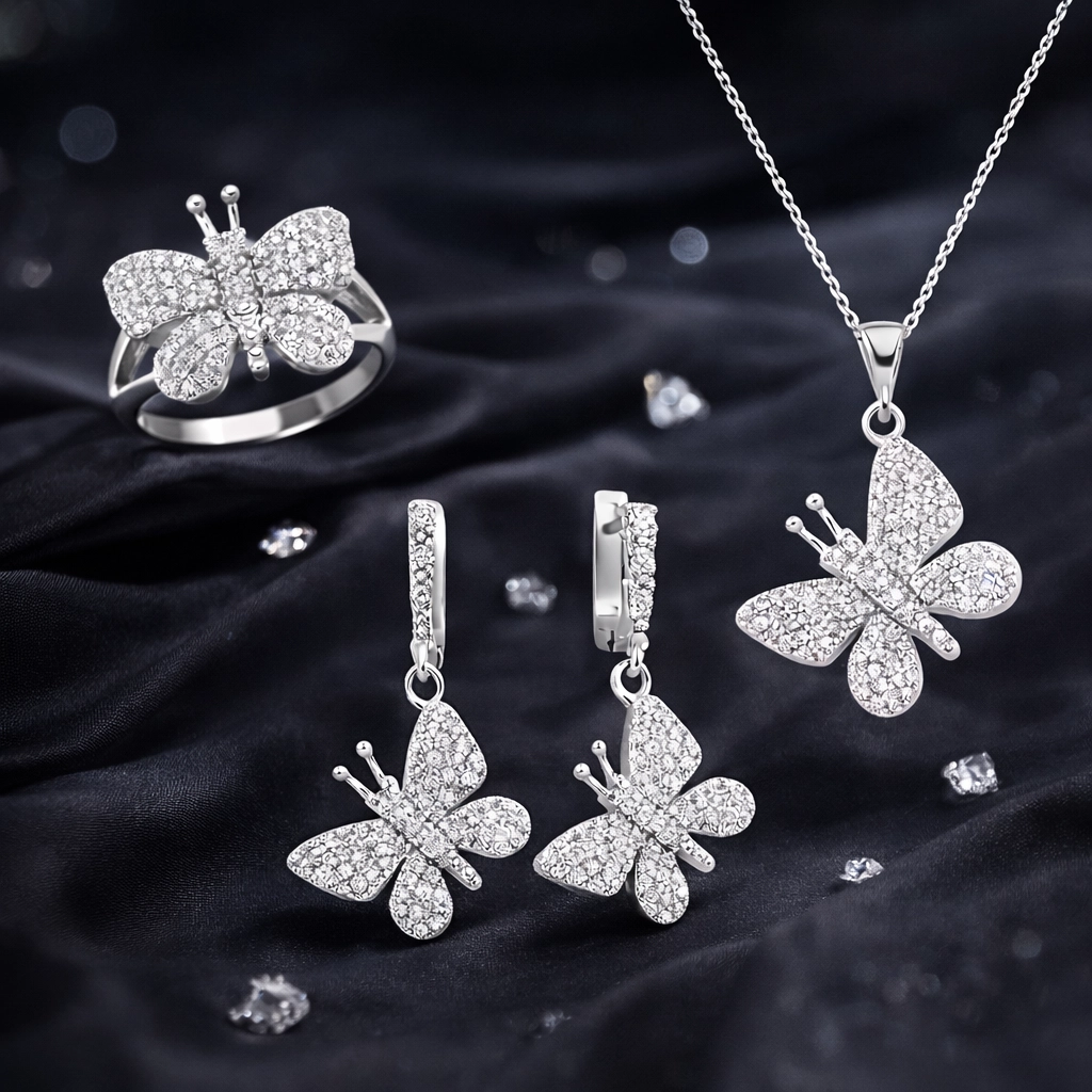 Özgürlüğü masumiyeti ve saflığı simgeleyen kelebekler, tertemiz sevginin ve aşkın ifadesidir. Bahar kelebekleri anlam itibari ile aşkın küçük bir kıvılcım ile başladığı daha sonra büyük bir sabır ile büyüdüğü ve en sonunda ilan-ı aşkı ifade eder. Bu harika set; doğum günü hediyesi, sevgililer günü hediyesi veya annelere hediye olarak özel günlerde tercih edilebilecek mükemmel bir seçenektir. Bu şık set 925 ayar gümüşten imal edilmiştir. Gümüş üzerine rodyum kaplama yapılmıştır. Rodyum kaplama yapılan gümüş bayan setler parlaklığını uzun süre muhafaza eder ve oksitlenmeyi geciktirir. Üzerinde bulunan taşlar zirkondur. Zincir boyu ortalama 45 cm"dir. Tüm gümüş bayan setlerde olduğu gibi gümüş kelebek bayan set de el emeği ile üretilmiştir. Gümüş ve değerli taşlar nedeniyle belirtilen ortalama ürün ağırlığında ± %10 sapma olabilmektedir.