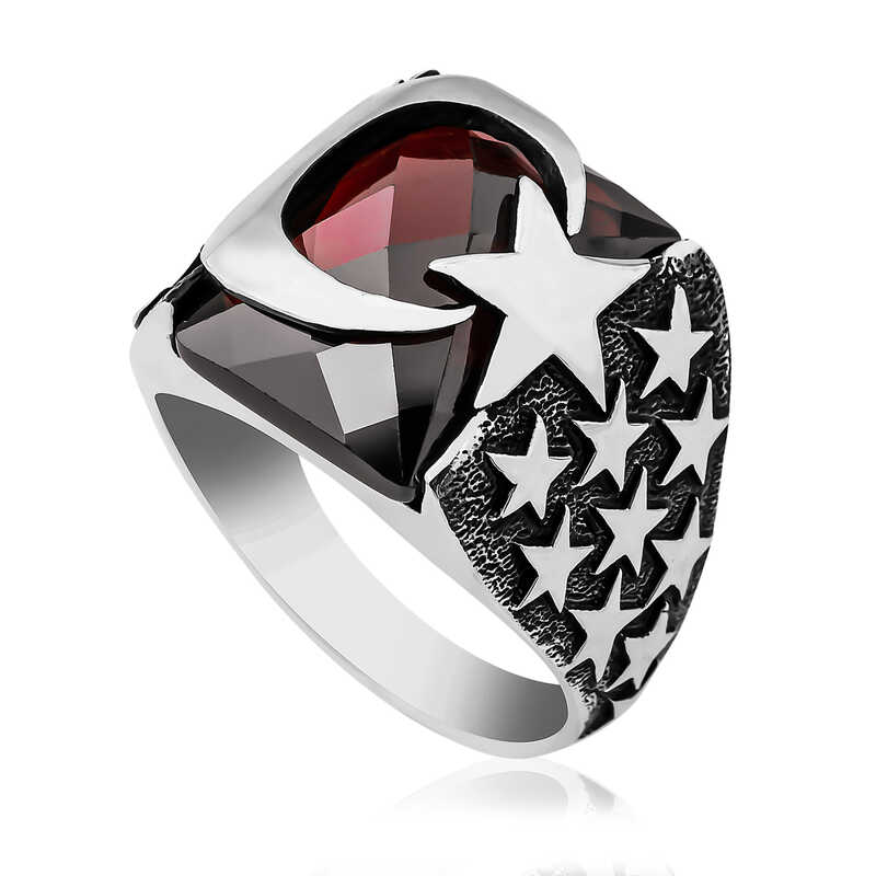 Gümüş Kırmızı Kesme Taşlı Ay Yıldız Erkek Yüzük